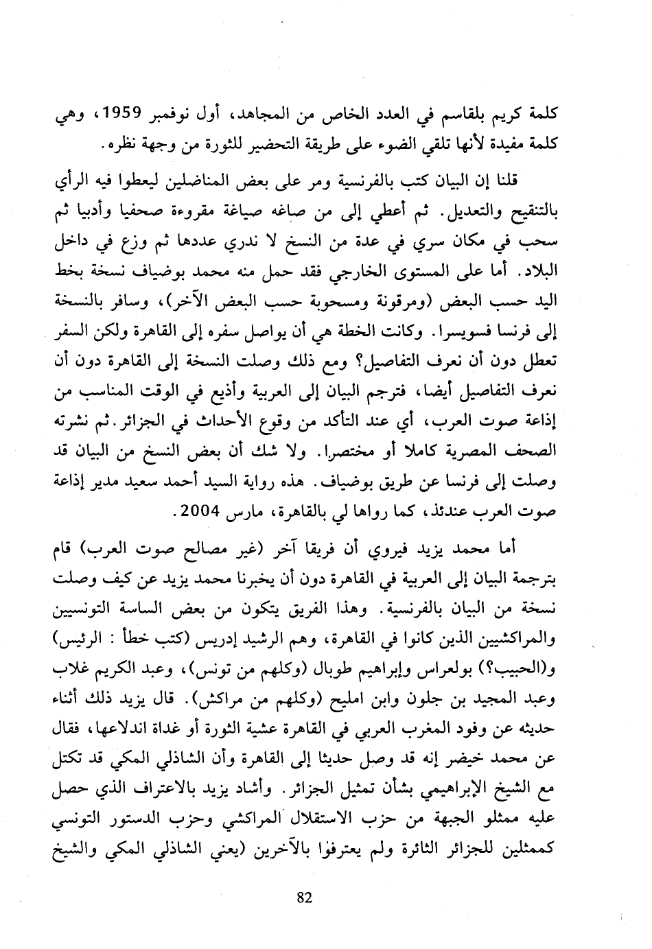 كلمة كريم بلقاسم في العدد الخاص من المجاهد، أول نوفمبر 1959، وهي كلمة مفيدة لأنها تلقي الضوء على طريقة التحضير للثورة من وجهة نظره. قلنا إن البيان كتب بالفرنسية ومر على بعض المناضلين ليعطوا فيه الرأي بالتنقيح والتعديل، ثم أعطي إلى من صاغه صياغة مقروءة صحفيا وأدبيا ثم سحب في مكان سري في عدة من النسخ لا ندري عددها ثم وزع في داخل البلاد، أما على المستوى الخارجي فقد حمل منه محمد بوضياف نسخة بخط اليد حسب البعض (ومرقونة ومسحوبة حسب البعض الآخر)، وسافر بالنسخة إلى فرنسا فسويسرا، وكانت الخطة هي أن يواصل سفره إلى القاهرة ولكن السفر تعطل دون أن نعرف التفاصيل؟ ومع ذلك وصلت النسخة إلى القاهرة دون أن نعرف التفاصيل أيضا، فترجم البيان إلى العربية وأذيع في الوقت المناسب من إذاعة صوت العرب، أي عند التأكد من وقوع الأحداث في الجزائر، ثم نشرته الصحف المصرية كاملا أو مختصرا، ولا شك أن بعض النسخ من البيان قد وصلت إلى فرنسا عن طريق بوضياف، هذه رواية السيد أحمد سعيد مدير إذاعة صوت العرب عندئذ، كما رواها لي بالقاهرة، مارس 2004. أما محمد يزيد فيروي أن فريقا آخر (غير مصالح صوت العرب) قام بترجمة البيان إلى العربية في القاهرة دون أن يخبرنا محمد يزيد عن كيف وصلت نسخة من البيان بالفرنسية، وهذا الفريق يتكون من بعض الساسة التونسيين والمراكشيين الذين كانوا في القاهرة، وهم الرشيد إدريس (كتب خطأ: الرئيس) و (الحبيب؟) بولعراس وإبراهيم طوبال (وكلهم من تونس)، وعبد الكريم غلاب وعبد المجيد بن جلون وابن امليح (وكلهم من مراكش)، قال يزيد ذلك أثناء حديثه عن وفود المغرب العربي في القاهرة عشية الثورة أو غداة اندلاعها، فقال عن محمد خيضر إنه قد وصل حديثا إلى القاهرة وأن الشاذلي المكي قد تكتل مع الشيخ الإبراهيمي بشأن تمثيل الجزائر، وأشاد يزيد بالاعتراف الذي حصل عليه ممثلو الجبهة من حزب الاستقلال المراكشي وحزب الدستور التونسي كممثلين للجزائر الثائرة ولم يعترفوا بالآخرين (يعني الشاذلي المكي والشيخ