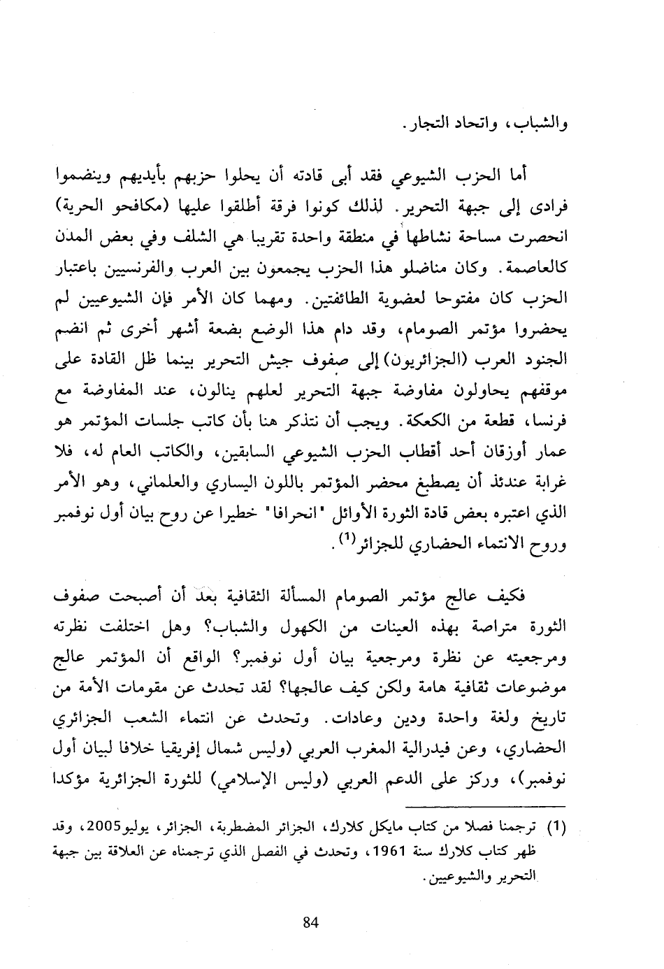 (1) ترجمنا فصلا من كتاب مايكل كلارك، الجزائر المضطربة، الجزائر، يوليو 2005، وقد ظهر كتاب كلارك سنة 1961، وتحدث في الفصل الذي ترجمناه عن العلاقة بين جبهة التحرير والشيوعيين.