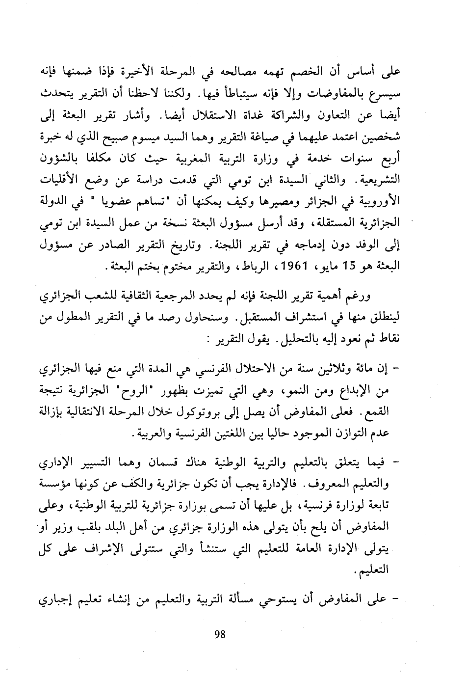 على أساس أن الخصم تهمه مصالحه في المرحلة الأخيرة فإذا ضمنها فإنه سيسرع بالمفاوضات وإلا فإنه سيتباطأ فيها، ولكننا لاحظنا أن التقرير يتحدث أيضا عن التعاون والشراكة غداة الاستقلال أيضا، وأشار تقرير البعثة إلى شخصين اعتمد عليهما في صياغة التقرير وهما السيد ميسوم صبيح الذي له خبرة أربع سنوات خدمة في وزارة التربية المغربية حيث كان مكلفا بالشؤون التشريعية، والثاني السيدة ابن تومي التي قدمت دراسة عن وضع الأقليات الأوروبية في الجزائر ومصيرها وكيف يمكنها أن (تساهم عضويا) في الدولة الجزائرية المستقلة، وقد أرسل مسؤول البعثة نسخة من عمل السيدة ابن تومي إلى الوفد دون إدماجه في تقرير اللجنة، وتاريخ التقرير الصادر عن مسؤول البعثة هو 15 مايو، 1961، الرباط، والتقرير مختوم بختم البعثة. ورغم أهمية تقرير اللجنة فإنه لم يحدد المرجعية الثقافية للشعب الجزائري لينطلق منها في استشراف المستقبل، وسنحاول رصد ما في التقرير المطول من نقاط ثم نعود إليه بالتحليل، يقول القرير: