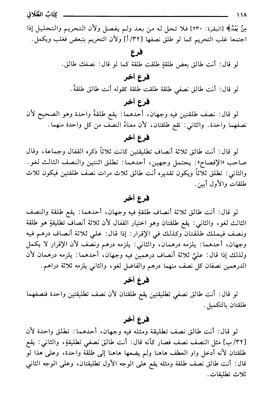 لو قال: أنت طالق ثلاثة أنصاف طلقةِ فيه وجهان: يقع طلقة والنصف الثالث لغو, والثاني: يقع طلقتان وهو اختيار القفال لأن ثلاثة أنصاف تطليقةٍ هو طلقة ونصف فيملك طلقتان وكذلك في الإقرار: إذا قال: علي ثلاثة أنصاف درهم فيه وجهان, أحدهما: يلزمه درهمان, والثاني: يلزمه درهم ونصف لأن الإقرار لا يكمل ولذلك إذا قال: علي ثلاثة أنصاف درهمين فيه وجهان, أحدهما: يلزمه درهمان لأن الدرهمين نصفان كل نصف منهما درهم والفاضل لغو, والثاني يلزمه ثلاثة دراهم.