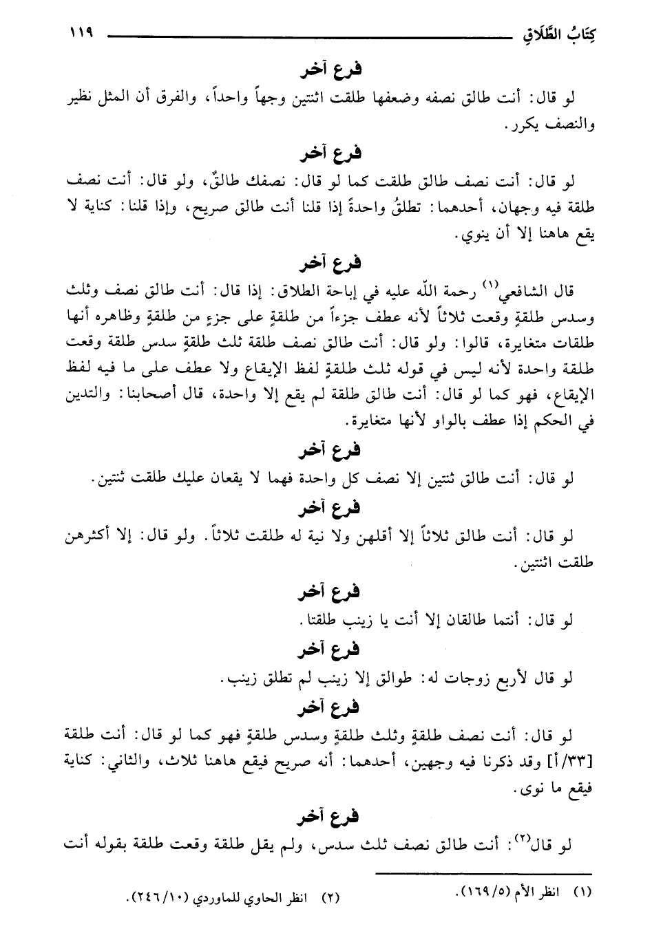 قال الشافعي: رحمة الله عليه في إباحة الطلاق: إذا قال: أنت طالق نصف وثلث وسدس طلقةٍ وقعت ثلاثًا لأنه عطف جزءًا من طلقةٍ على جزءٍ من طلقةٍ وظاهره أنها طلقات متغايرة, قالوا: ولو قال: أنت طالق نصف طلقة ثلث طلقةٍ سدس وقعت طلقة واحدة لأنه ليس في قوله ثلث طلقةٍ لفظ الإيقاع ولا عطف على ما فيه لفظ الإيقاع, فهو كما لو قال: أنت طالق طلقة لم يقع إلا واحدة, قال أصحابنا: والتدين في الحكم إذا عطف بالواو لأنها متغايرة.