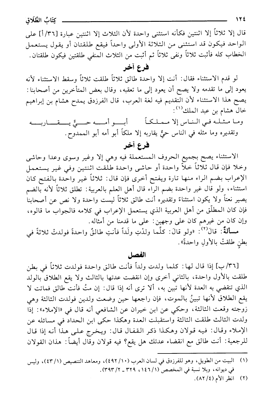 لو قدم الاستثناء فقال: أنت إلا واحدة طالق ثلاثًا طلقت ثلاثًا وسقط الاستثناء أنه يعود إلى ما تقدمه ولا يصح أن يعود إلى ما تقدمه ولا يصح أن يعود إلى ما تعقبه, وقال بعض المتأخرين من أصحابنا: يصح هذا الاستثناء لأن التقديم فيه لغة العرب, قال الفرزدق يمدح هشام بن إبراهيم خالد هشام بن عبد الملك:
