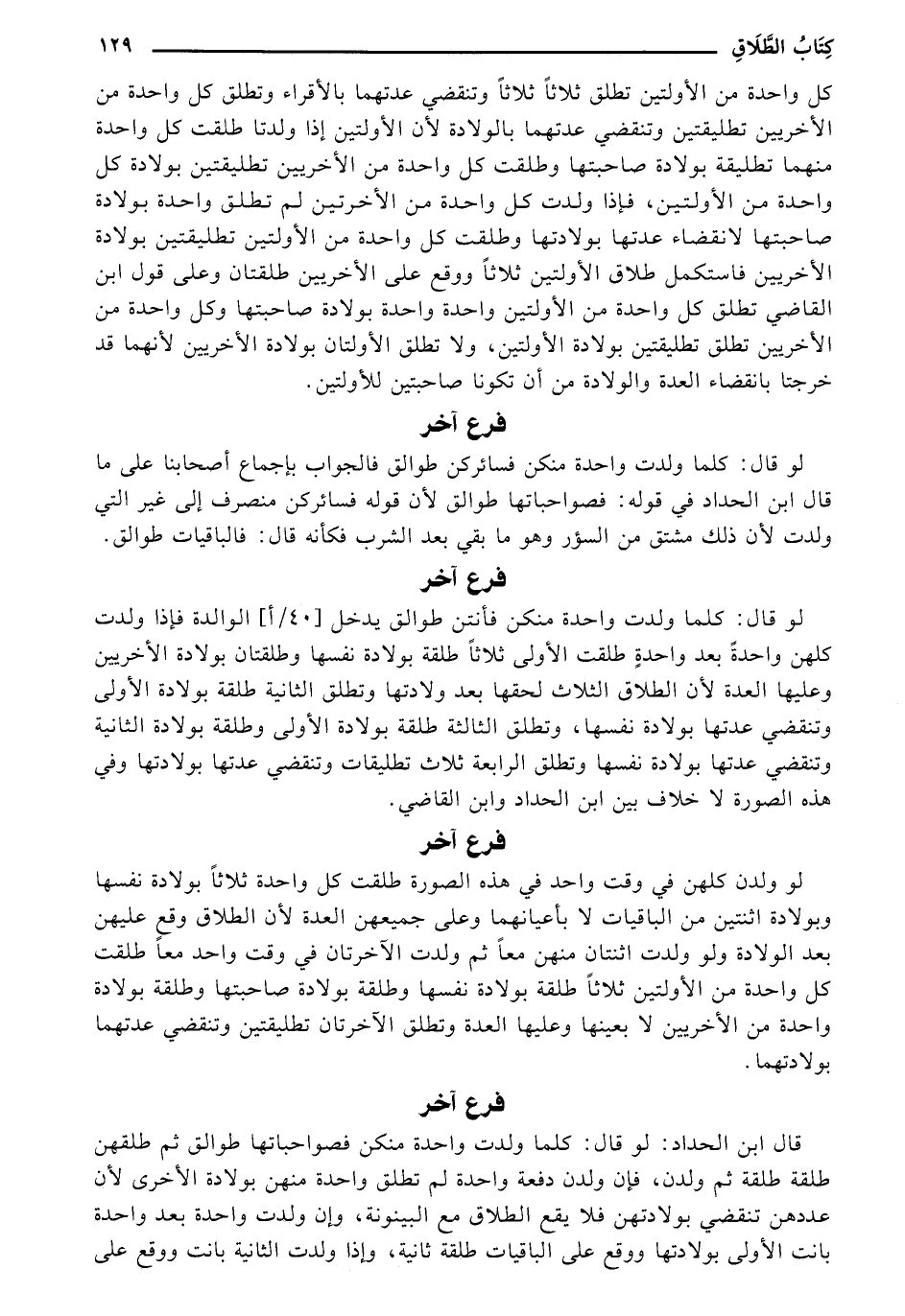 لو قال: كلما ولدت واحدة منكن فأنتن طوالق يدخل [40/ أ] الوالدة فإذا ولدت كلهن واحدةً بعد واحدةٍ الأولى ثلاثًا طلقة بولادة نفسها وطلقتان بولادة الأخريين وعليها العدة لأن الطلاق الثلاث لحقتها بعد ولادتها وتطلق الثانية طلقة بولادة الأولى وتنقضي عدتها بولادة نفسها, وتطلق الثالثة طلقة بولادة الأولى وطلقة بولادة الثانية وتنقضي عدتها بولادة نفسها وتطلق الرابعة ثلاث تطليقات وتنقضي عدتها بولادتها وفي هذه الصورة لا خلاف بين ابن الحداد وابن القاضي.