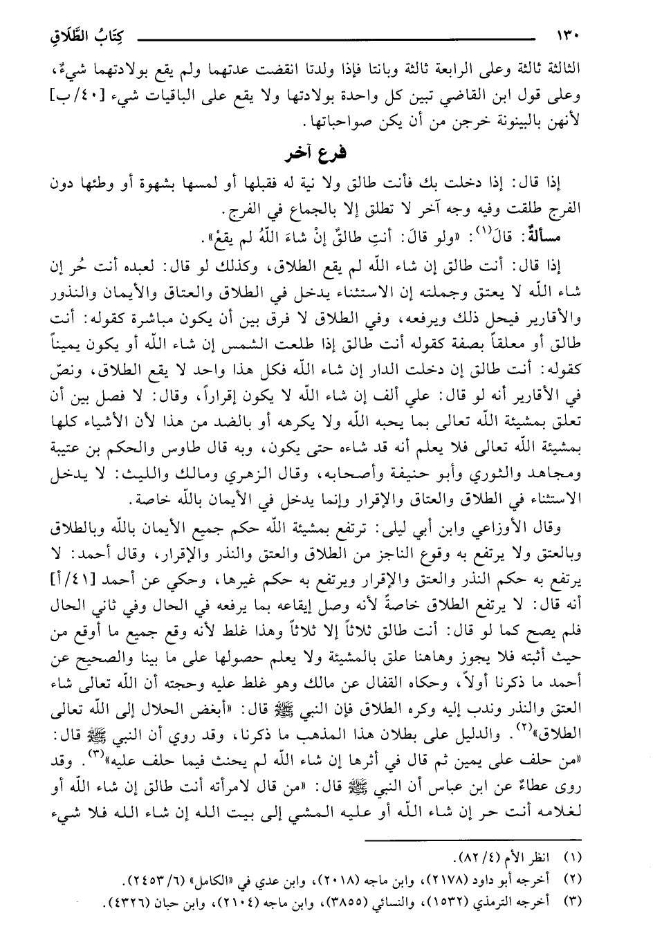 إذا قال: أنت طالق إن شاء الله لم يقع الطلاق, وكذلك لو قال: لعبده أنت حر إن شاء الله لا يعتق وجملته إن الاستثناء يدخل في الطلاق والعتاق والإيمان والنذور والأقارير فيحل ذلك ويرفعه, وفي الطلاق لا فرق بين أن يكون مباشرة كقوله: أنت طالق ومعلقًا بصفة كقوله أنت طالق إذا طلعت الشمس إن شاء الله أو يكون يمينًا كقوله: أنت طالق إن دخلت الدار إن شاء الله فكل هذا واحد لا يقع الطلاق, ونص في الأقارير أنه لو قال: علي ألف إن شاء الله لا يكون إقرارًا, وقال: لا فصل بين أن تعلق بمشيئة الله تعالى بما يحبه الله ولا يكرهه أو بالضد من هذا لأن الأشياء كلها بمشيئة الله تعالى فلا يعلم أنه قد شاءه حتى يكون, وبه قال طاوس والحكم بن عتبية وجاهد والثوري وأبو حنيفة وأصحابه, وقال الزهري ومالك والليث: لا يدخل الاستثناء في الطلاق والعتاق والإقرار وإنما يدخل في الإيمان بالله خاصة.