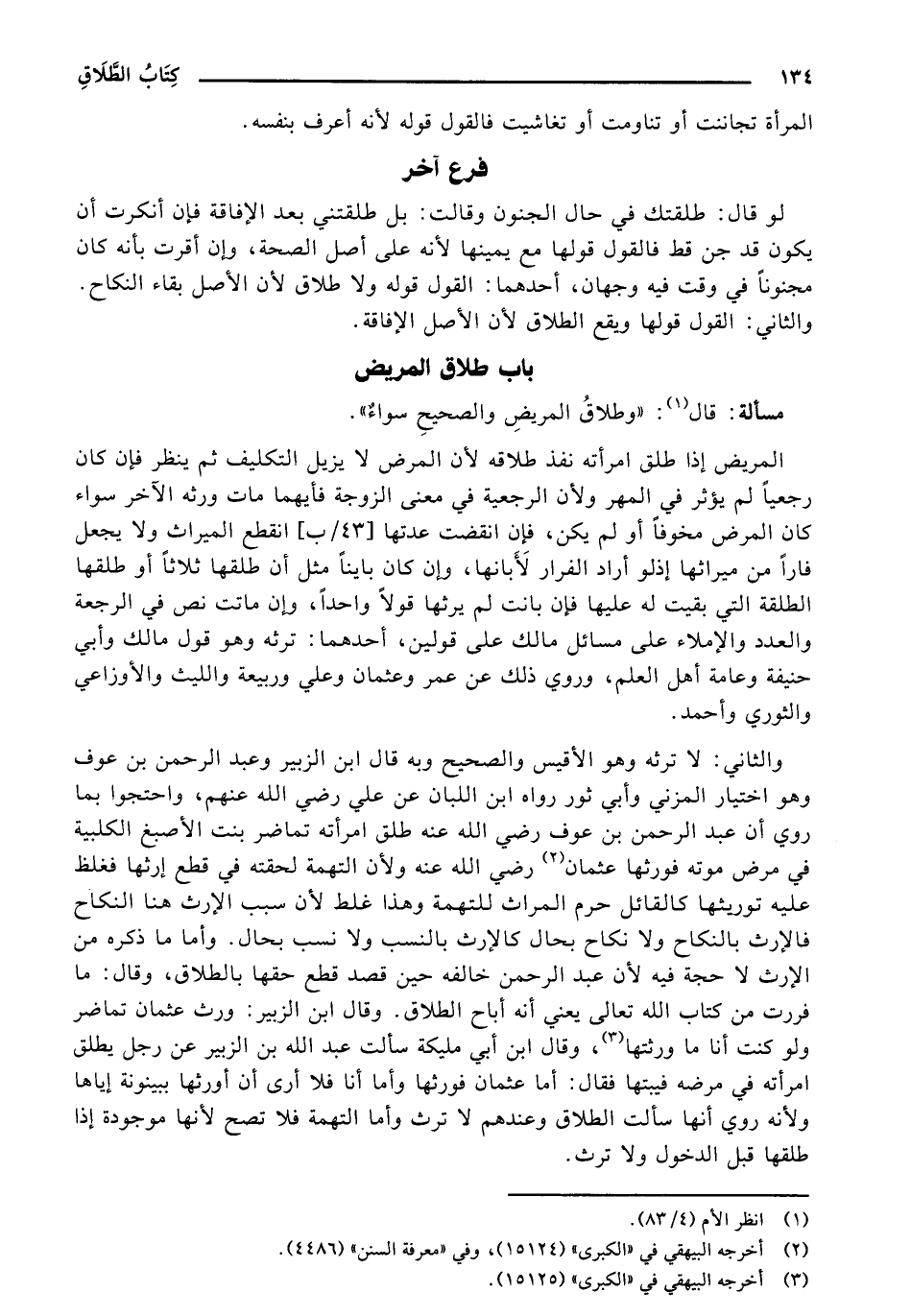 المريض إذا طلق امرأته نفذ طلاقه لأن المرض لا يزيل التكليف ثم ينظر فإن كان رجعيًا لم يؤثر في المهر ولأن الرجعية في معنى الزوجة فأيهما مات ورثه الآخر سواء كان المرض مخوفًا أو لم يكن, فإن انقضت عدتها [43/ ب] انقطع الميراث ولا يجعل فارًا من ميراثها إذلو أراد الفرار لأبانها, وإن كان باينًا مثل أن طلقها ثلاثًا أو طلقها الطلقة التي بقيت له عليها فإن بانت لم يرثها قولاً واحدًا, وإن ماتت نص في الرجعة والعدد والإملاء على مسائل مالك على قولين, أحدهما: ترثه وهو قول مالك وأبي حنيفة وعامة أهل العلم, وروي ذلك عن عمر وعثمان وعلي وربيعة والليث والأوزاعي والثوري وأحمد.