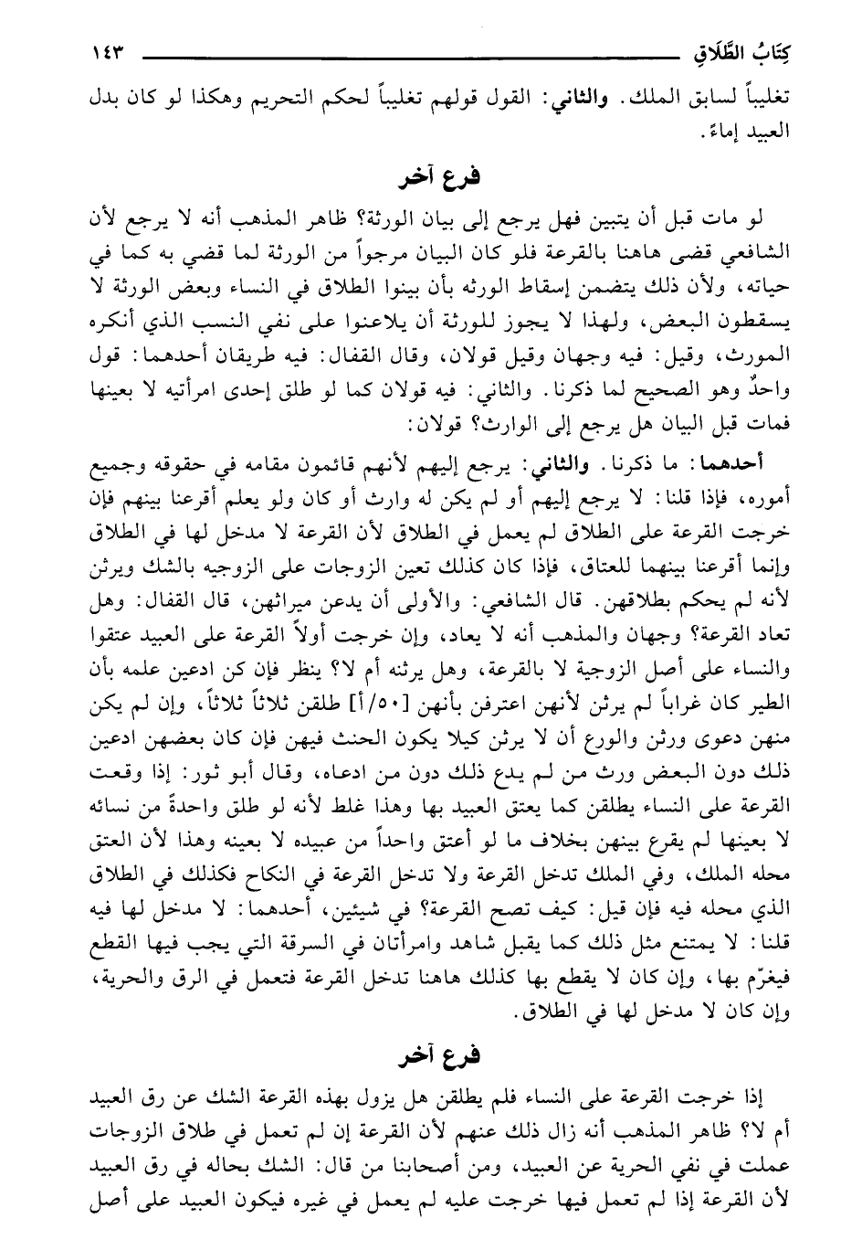 أحدهما: ما ذكرنا. والثاني: يرجع إليهم لأنهم قائمون مقامه في حقوقه وجميع أموره, فإذا قلنا: لا يرجع إليهم أو لم يكن له وارث أو كان ولو يعلم أقرعنا بينهم فإن خرجت القرعة على الطلاق لم يعمل في الطلاق لأن القرعة لا مدخل لها في الطلاق وإنما أقرعنا بينهما للعتاق, فإذا كان كذلك تعين الزوجات على الزوجية بالشك ويرثن لأنه لم يحكم بطلاقهن. قال الشافعي: والأولى أن يدعن ميراثهن, قال القفال: وهل تعاد القرعة؟ وجهان والمذهب أنه لا يعاد, وإن خرجت أولاً القرعة على العبيد عتقوا والنساء على أصل الزوجية لا بالقرعة, وهل يرثنه أم لا؟ ينظر فإن كن ادعين علمه بأن الطير كان غرابًا لم يرثن لأنهن اعترفن بأنهن [50/ أ] طلقن ثلاثًا ثلاثًا, وإن لم يكن منهم دعوى ورثن والورع أن لا يرثن كيلا يكون الحنث فيهن فإن كان بعضهن ادعين ذلك دون البعض ورث من لم يدع ذلك من ادعاه, وقال أبو ثور: إذا وقعت القرعة على النساء يطلقن كما يعتق العبيد بها وهذا غلط لأنه لو طلق واحدةً من نسائه لا بعينها لم يقرع بينهن بخلاف ما لو أعتق واحدًا من عبيده لا بعينه وهذا لأن العتق محله الملك, وفي الملك تدخل القرعة في النكاح فكذلك في الطلاق الذي محله فإن قيل: كيف تصح القرعة؟ في شيئين, أحدهما: لا مدخل لها فيه قلنا: لا يمتنع مثل ذلك كما يقبل شاهد وامرأتان في السرقة التي يجب فيها القطع فيغرم بها, وإن كان لا يقطع بها كذلك هاهنا تدخل القرعة فتعمل في الرق والحرية, وإن كان لا مدخل لها في الطلاق.