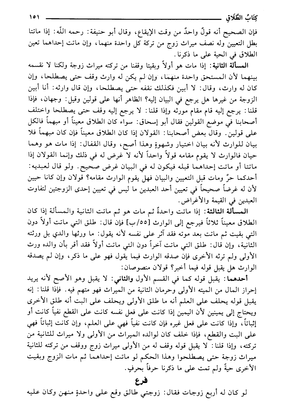 المسألة الثانية: إذا مات أولاً وبقيتا وقفنا من تركته ميراث زوجة ولكنا لا نقسمه بينهما لأن المستحق واحدة منهما، وإن لم يكن له وارث وقف حتى يصطلحا، وإن كان له وارث، وقال: لا أبين فكذلك نفقه حتى يصطلحا، وإن قال وارثه: أنا أبين الزوجة من غيرها هل يرجع في البيان إليه؟ الظاهر أنها على قولين وقيل: وجهان، فإذا قلنا: يرجع إليه قام مقام مورثه وإذا قلنا: لا يرجع إليه وقف حتى يصطلحا واختلف أصحابنا في موضع القولين فقال أبو إسحاق: سواء كان الطلاق معينًا أو مبهمًا فالكل على قولين. وقال بعض أصحابنا: القولان إذا كان الطلاق معينًا فإن كان مبهمًا فلا بيان للوارث لأنه بيان اختيار وشهوٍة وهذا أصح، وقال القفال: إذا مات هو وهما حيان فالوارث لا يقوم مقامه قولًا واحدًا لأنه لا غرض له في ذلك وإنما القولان إذا ماتتا أو ماتت إحداهما قبله فيكون له في البيان غرض صحيح. ولو قال لعبديه: أحدكما حرٌ ومات قبل التعيين والبيان فهل يقوم الوارث مقامه؟ قولان وإن كانا حيين لأن له غرضًا صحيحًا في تعيين أحد العبدين ما ليس في تعيين إحدى الزوجتين لتفاوت العبدين في القيمة والأغراض.