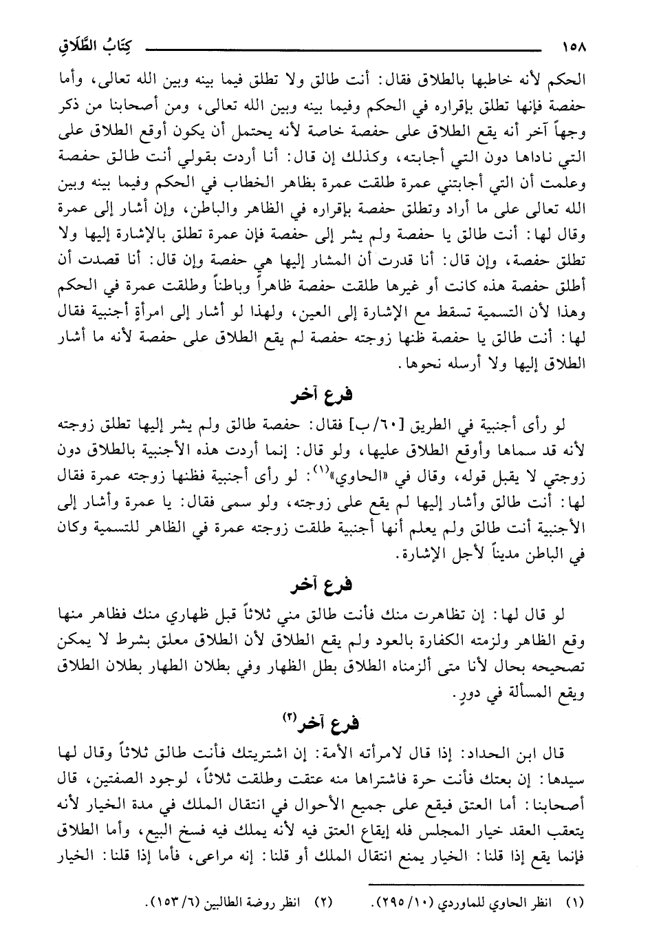 لو أرى أجنبية في الطريق [60/ ب] فقال: حفصة طالق ولم يشر إليها تطلق زوجته لأنه قد سماها وأوقع الطلاق عليها، ولو قال: إنما أردت هذه الأجنبية بالطلاق دون زوجتي لا يقبل قوله، وقال في "الحاوي": لو رأى أجنبية فظنها زوجته عمرة فقال لها: أنت طالق وأشار إليها لم يقع على زوجته، ولو سمى فقال: يا عمرة وأشار إلى الأجنبية أنت طالق ولم يعلم أنها أجنبية طلقت زوجته عمرة في الظاهر للتسمية وكان في الباطن مدينًا لأجل الإشارة.