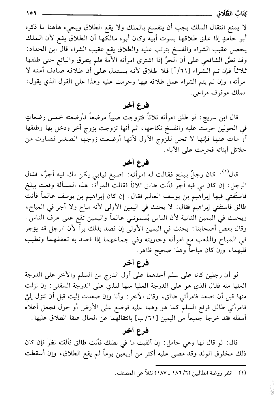 قال: كان رجلٌ ببلخ فقالت له امرأته: اصبغ ثيابي يكن لك فيه أجرٌ، فقال الرجل: إن كان لي فيه أجر فأنت طالق ثلاثًا فقالت المرأة: هذه المسألة وقعت ببلخ فاستُفتي فيها إبراهيم بن يوسف العالم فقال: إن كان إبراهيم بن يوسف عالمًا فأنت طالق فاستفتي إبراهيم فقال: لا يحنث في اليمين الأولى لأنه مباح ولا أجر في المباح، ويحنث في اليمين الثانية لأن الناس يُسمونني عالمًا واليمين تقع على عرف الناس. وقال بعض أصحابنا: يحنث في اليمين الأولى إن قصد بذلك برًا لأن الرجل قد يؤجر في المباح واللعب مع امرأته وجاريته وفي جماعهما إذا قصد به تعففهما وتطيب قلبهما، وإن كان مباحًا وهذا صحيح ظاهر.