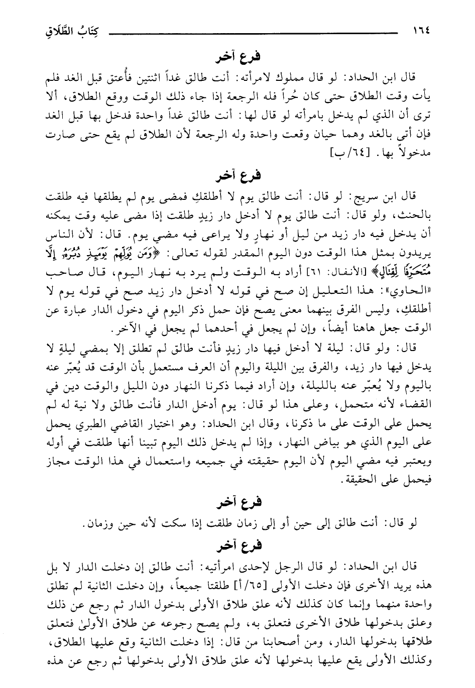 قال ابن سريج: لو قال: أنت طالق يوم لا أطلقكٍ فمضى يوم لم يطلقها فيه طلقت بالحنث، ولو قال: أنت طالق يوم لا أدخل دار زيدٍ طلقت إذا مضى عليه وقت يمكنه أن يدخل فيه دار زيد من ليل أو نهار ولا يراعى فيه مضى يوم. قال: لأن الناس يريدون بمثل هذا الوقت دون اليوم المقدر لقوله تعالى: {وَمَنْ يُوَلِّهِمْ يَوْمَئِذٍ دُبُرَهُ إِلَّا مُتَحَرِّفًا لِقِتَالٍ} [الأنفال:] 16 أراد به الوقت ولم يرد به نهار اليوم، قال صاحب (الحاوي): هذا التعليل إن صح في قوله لا أدخل دار زيد صح في قوله يوم لا أطلقكِ، وليس الفرق بينهما معنى يصح فإن حمل ذكر اليوم في دخول الدار عبارة عن الوقت جعل ها هنا أيضًا، وغن لم يجعل في أحدهما لم يجعل في الآخر.