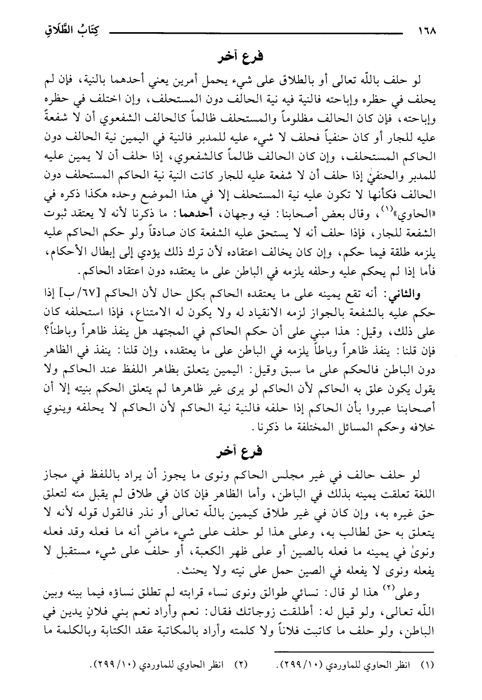 لو حلف بالله تعالى أو بالطلاق على شيء يحمل أمرين يعنى أحدهما بالنية، فإن لم يحلف في حظره وإباحته فالنية فيه نية الحالف دون المستحلف، وإن اختلف في حظره وإباحته، فإن كان الحالف مظلومًا والمستحلف ظالمًا كالحالف الشفوي أن لا شفعةٌ عليه للجار أو كان حنفيًا فحلف لا شيء عليه للمدبر فالنية في اليمين نية الحالف دون الحاكم المستحلف، وإن كان الحلف ظالمًا كالشفوي، إذا حلف أن لا يمين عليه للمدبر والحنفي إذا حلف أن لا شفعة عليه للجار كانت النية نية الحاكم المستحلف دون الحالف فكأنها لا تكون عليه نية المستحلف إلا في هذا الموضع وحده هكذا ذكره في (الحاوي)، وقال بعض أصحابنا: فيه وجهان، أحدهما: ما ذكرنا لأنه لا يعتقد ثبوت الشفعة للجار، فإذا حلف أنه لا يستحق عليه الشفعة كان صادقًا ولو حكم الحاكم عليه يلزمه طلقة فيما حكم، وإن كان يخالف اعتقاده لأن ترك ذلك يؤدى إلى إبطال الأحكام، فأما إذا لم يحكم عليه وحلفه يلزمه في الباطن على ما يعتقده دون اعتقاد الحاكم.