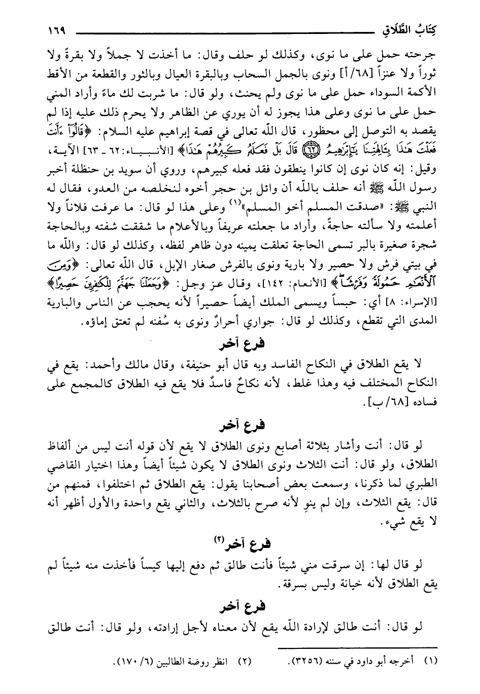 جرحته حمل على ما نوى، وكذلك لو حلف وقال: ما أخذت لا جملًا ولا بقرةً ولا ثورًا ولا عنزٌ [68/ أ] ونوى بالجمل السحاب وبالبقرة العيال وبالثور والقطعة من الأقط الأكمة السوداء حمل على ما نوى ولم يحنث، ولو قال: ما شربت لك ماءٌ وأراد المني حمل على ما نوى وعلى هذا يجوز له أن يورى عن الظاهر ولا يحرم ذلك عله إذا لم يقصد به التوصل إلى محظور، قال الله تعالى في قصة إبراهيم عليه السلام: {قَالُوا أَأَنْتَ فَعَلْتَ هَذَا بِآَلِهَتِنَا يَا إِبْرَاهِيمُ (62) قَالَ بَلْ فَعَلَهُ كَبِيرُهُمْ هَذَا}] الأنبياء: 62 - 63 [الآية، وقيل: إنه كان نوى إن كانوا ينطقون فقد فعله كبيرهم، وروى أن سويد بن حنظلة أخبر رسول الله صلى الله عليه وسلم أنه حلف بالله أن وائل بن حجر أخوه لنخلصه من العدو، فقال له النبيصلى الله عليه وسلم: (صدقت المسلم أخو المسلم) وعلى هذا لو قال: ما عرفت فلانًا ولا أعلمته ولا سألته حاجةٌ، وأراد ما جعلته عريفًا وبالأعلام ما شققت شفته وبالحاجة شجرة صغيرة بالبر تسمى الحاجة تعلقت يمينه دون ظاهر لفظه، وكذلك لو قال: والله ما في بيتي فرش ولا حصير ولا بارية ونوى بالفرش صغار الإبل، قال الله تعالى: {وَمِنَ الْأَنْعَامِ حَمُولَةً وَفَرْشًا} [الأنعام:142]، وقال عز وجل {وَجَعَلْنَا جَهَنَّمَ لِلْكَافِرِينَ حَصِيرًا} [الإسراء:8] أي: حبسًا ويسمى الملك أيضًا حصيرًا لأنه يحجب عن الناس والبارية المدى التي تقطع، وكذلك لو قال: جواري أحرارٌ ونوى به سُفنه لم تعتق إماؤه.
