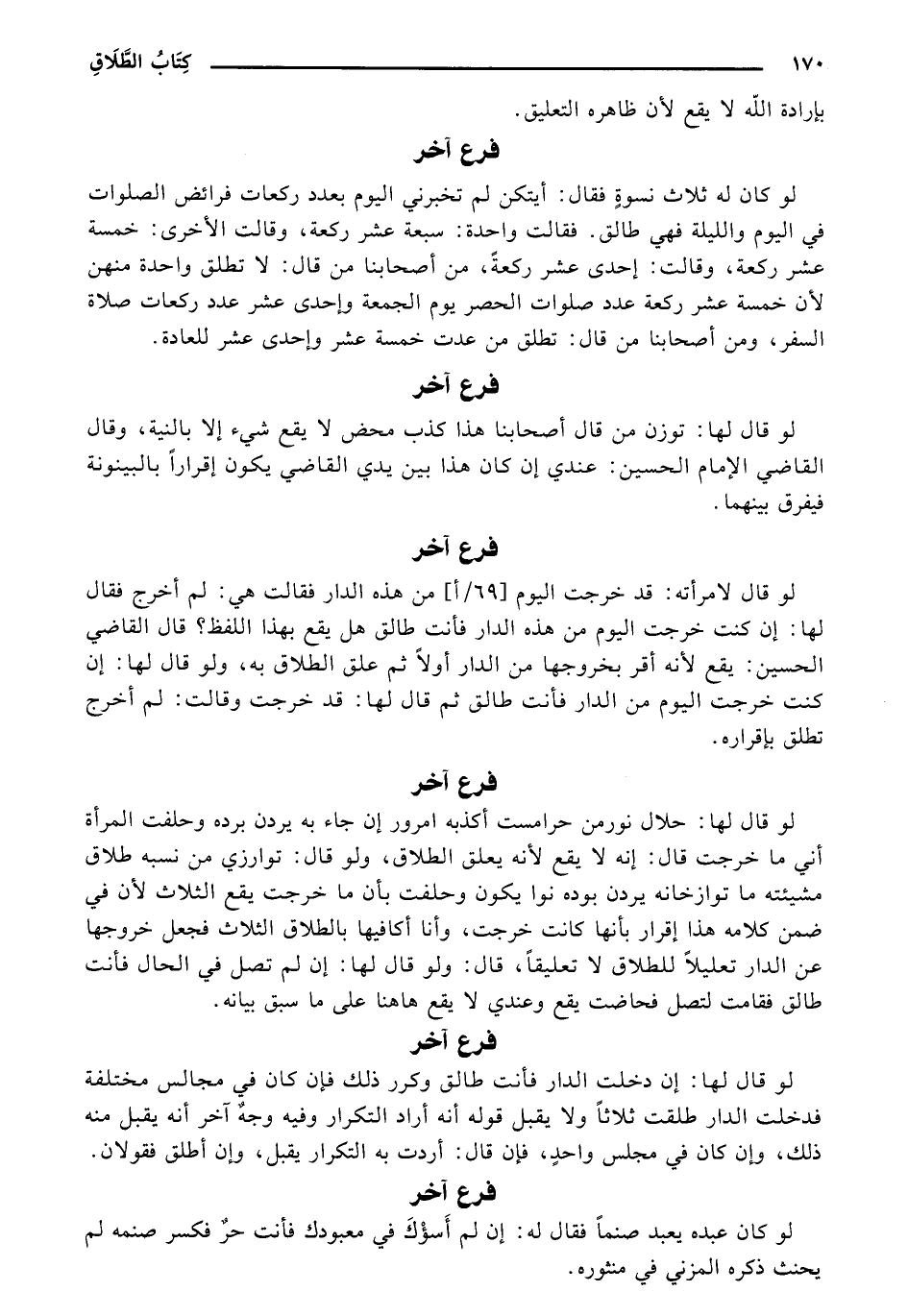 لو قال لها: حلال نورمن حرامست أكذبه امرور إن جاء به يردن برده وحلفت المرأة أنى ما خرجت قال: إنه لا يقع لأنه يعلق الطلاق، ولو قال: توارزى من نسبه طلاق مشيئته ما توازخانه يردن بوده نوا يكون وحلفت بأن ما خرجت يقع الثلاث لأنه في ضمن كلامه هذا إقرار بأنها كانت خرجت، وأنا أكافيها بالطلاق الثلاث فجعل خروجها عن الدار تعليلًا للطلاق لا تعليقًا، قال: ولو قال لها: إن لم تصل في الحال فأنت طالق فقامت لتصل فحاضت يقع وعندي لا يقع هاهنا على ما سبق بيانه.
