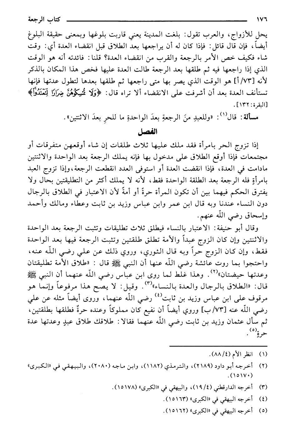 إذا تزوج الحر بامرأة فقد ملك عليها ثلاث طلقات إن شاء أوقعهن متفرقات أو مجتمعات فإذا أوقع الطلاق على مدخول بها فإنه يملك الرجعة بعد الواحدة والاثنتين مادامت في العدة، فإذا انقضت العدة أو استوفي العدد انقطعت الرجعة، وإذا تزوج العبد بامرأةٍ فله الرجعة بعد الطلقة الواحدة فقط، لأنه لا يملك أكثر من التطليقتين بحال ولا يفترق الحكم فيهما بين أن تكون المرأة حرةً أو أمةً لأن الاعتبار في الطلاق بالرجال دون النساء عندنا وبه قال ابن عمر وابن عباس وزيد بن ثابت وعطاء ومالك وأحمد وإسحاق رضي الله عنهم.