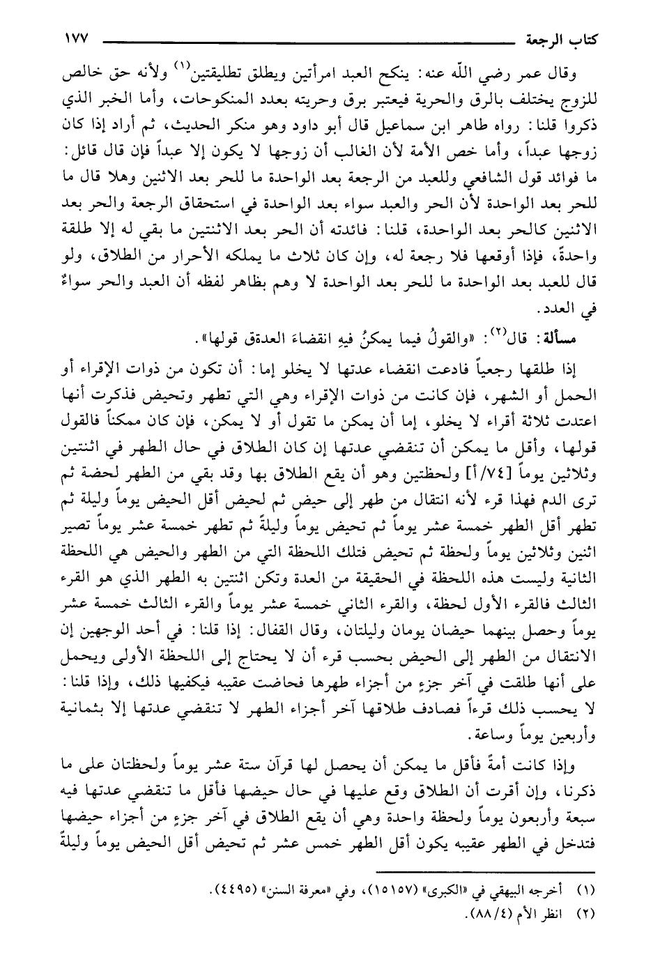 وقال عمر رضي الله عنه: ينكح العبد امرأتين ويطلق تطليقتين ولأنه حق خالص للزوج يختلف بالرق والحرية فيعتبر برق وحريته بعدد المنكوحات، وأما الخبر الذي ذكروا قلنا: رواه طاهر ابن سماعيل قال أبو داود وهو منكر الحديث، ثم أراد إذا كان زوجها عبدًا، وأما خص الأمة لأن الغالب أن زوجها لا يكون إلا عبدًا فإن قال قائل: ما فوائد قول الشافعي وللعبد من الرجعة بعد الواحدة ما للحر بعد الاثنين وهلا قال ما للحر بعد الواحدة لأن الحر والعبد سواء بعد الواحدة في استحقاق الرجعة والحر بعد الاثنين كالحر بعد الواحدة، قلنا: فائدته أن الحر بعد الاثنتين ما بقي له إلا طلقة واحدةً، فإذا أوقعها فلا رجعة له، وإن كان ثلاث ما يملكه الأحرار من الطلاق، ولو قال للعبد بعد الواحدة ما للحر بعد الواحدة لا وهم بظاهر لفظه أن العبد والحر سواءٌ في العدد.