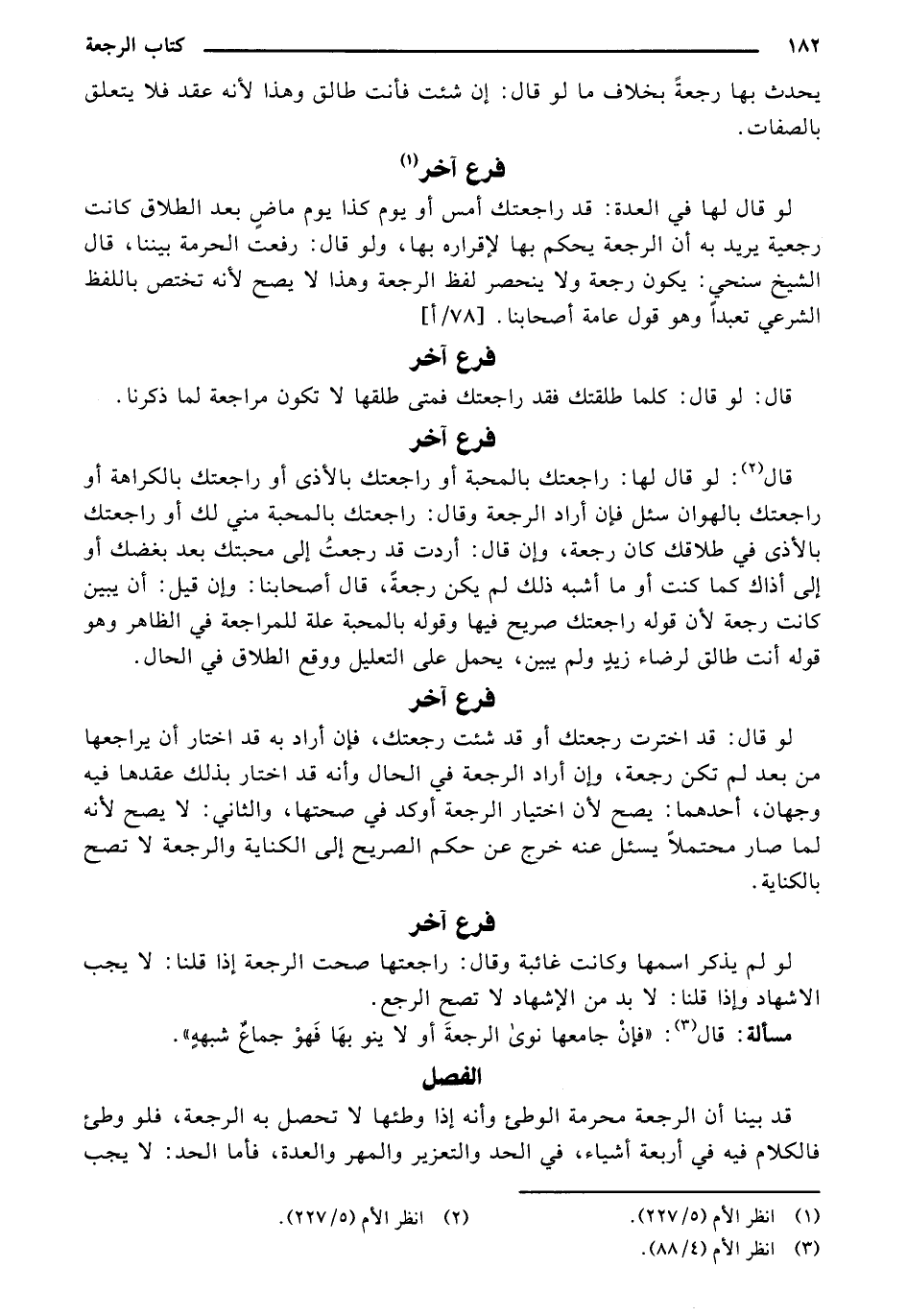 قال: لو قال لها: راجعتك بالمحبة أو راجعتك بالأذى أو راجعتك بالكراهية أو راجعتك بالهوان سئل فإن أراد الرجعة وقال: راجعتك بالمحبة مني لك أو راجعتك بالأذى في طلاقك كان رجعة، وإن قال: أردت قد رجعتُ إلى محبتك بعد بغضك أو إلى أذاك كما كنت أو ما أشبة ذلك لم يكن رجعةً، قال أصحابنا: وإن قيل: أن يبين كانت رجعة لأن قوله راجعتك صريح فيها وقوله بالمحبة علة للمراجعة في الظاهر وهو قوله أنت طالق لرضاء زيدٍ ولم يبين، يحمل على التعليل ووقع الطلاق في الحال.