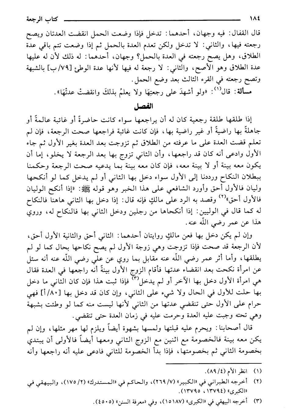 إذا طلقها طلقة رجعية كان له أن يراجعها سواء كانت حاضرةً أو غائبة عالمةً أو جاهلةً بها راضيةً أو غير راضية بها، فإن كانت غائبة فراجعها صحت الرجعة، فإن لم تعلم قضت العدة على ما عرفته من الطلاق ثم تزوجت بعد العدة بغير الأول ثم جاء الأول وادعى أنه قد راجعها، وأن الثاني تزوج بها بعد الرجعة لا يخلو، إما أن يكون معه بينة أو لا بينة معه، فإن كان معه بينة بما يدعيه صحت الرجعة وحكمنا ببطلان النكاح ورددنا إلى الأول سواء دخل بها الثاني أو لم يدخل كما لو أنكحها وليان فالأول أحق وأورد الشافعي على هذا الخبر وهو قوله صلى الله عليه وسلم: "إذا أنكح الوليان فالأول أحق" وقصد به الرد على مالكٍ فإنه قال: إذا دخل بها الثاني هاهنا فالنكاح له كما قال في الوليين: إذا أنكحاها من رجلين ودخل الثاني بها فالنكاح له، وروي هذا عن عمر رضي الله عنه.