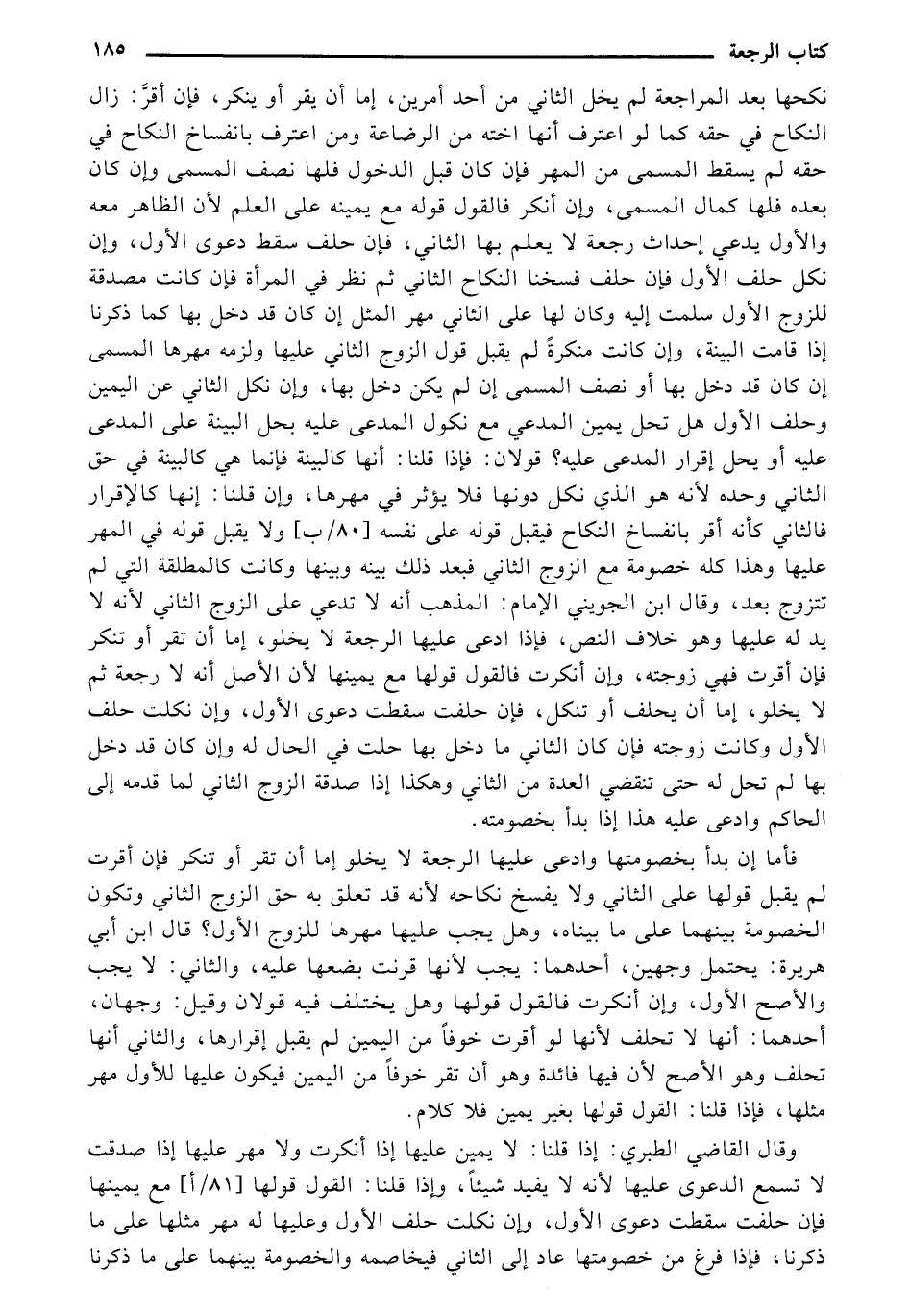 نكحها بعد المراجعة لم يخل الثاني من أحد أمرين، إما أن يقر أو ينكر، فإن أقرَّ: زال النكاح في حقه كما لو اعترف أنها أخته من الرضاعة ومن اعترف بانفساخ النكاح في حقه لم يسقط المسمى من المهر فإن كان قبل الدخول فلها نصف المسمى وإن كان بعده فلها كمال المسمى، وإن أنكر فالقول قوله مع يمينه على العلم لأن الظاهر معه والأول يدعي إحداث رجعة لا يعلم بها الثاني، فإن حلف سقط دعوى الأول، وإن نكل حلف الأول فإن حلف فسخنا النكاح الثاني ثم نظر في المرأة فإن كانت مصدقة للزوج الأول سلمت إليه وكان لها على الثاني مهر المثل إن كان قد دخل بها كما ذكرنا إذا قامت البينة، وإن كانت منكرةً لم يقبل قول الزوج الثاني عليها ولزمه مهرها المسمى إن كان قد دخل بها أو نصف المسمى إن لم يكن دخل بها، وإن نكل الثاني عن اليمين وحلف الأول هل تحل يمين المدعي مع نكول المدعى عليه بحل البينة على المدعى عليه أو يحل إقرار المدعى عليه؟ قولان: فإذا قلنا: أنها كالبينة فإنما هي كالبينة في حق الثاني وحده لأنه هو الذي نكل دونها فلا يؤثر في مهرها، وإن قلنا: إنها كالإقرار فالثاني كأنه أقر بانفساخ النكاح فيقبل على نفسه [80/ ب] ولا يقبل قوله في المهر عليها وهذا كله خصومة مع الزوج الثاني فبعد ذلك بينه وبينها وكانت كالمطلقة التي لم تتزوج بعد، وقال ابن الجويني الإمام: المذهب أنه لا تدعي على الزوج الثاني لأنه لا يد له عليها وهو خلاف النص، فإذا ادعى عليها الرجعة لا يخلو، إما أن تقر أو تنكر فإن أقرت فهي زوجته، وإن أنكرت فالقول قولها مع يمينها لأن الأصل أنه لا رجعة ثم لا يخلو، إما أن يحلف أو تنكل، فإن حلفت سقطت دعوى الأول، وإن نكلت حلف الأول وكانت زوجته فإن كان الثاني ما دخل بها حلت في الحال له وإن كان قد دخل بها لم تحل له حتى تنقضي العدة من الثاني وهكذا إذا صدقة الزوج الثاني لما قدمه إلى الحاكم وادعى عليه هذا إذا بدأ بخصومته.