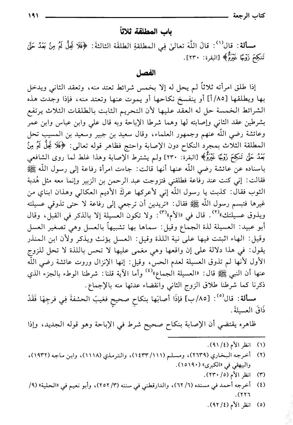 إذا طلق امرأته ثلاثا لم يحل له إلا بخمس شرائط تعتد منه، وتعقد الثاني ويدخل بها ويطلقها [85/ أ] أو ينفسخ نكاحها أو يموت عنها وتعتد منه، فإذا وجدت هذه الشرائط الخمسة حل له العقد عليها لأن التحريم الثابت بالطلقات الثلاث يرتفع بشرطين عقد الثاني وإصابته لها وهما شرطا الإباحة وبه قال على وابن عباس وابن عمر وعائشة رضي الله عنهم وجمهور العلماء، وقال سعيد بن جبير وسعيد بن المسيب تحل المطلقة الثلاث بمجرد النكاح دون الإصابة واحتج فظاهر قوله تعالى: {فَلَا تَحِلُّ لَهُ مِنْ بَعْدُ حَتَّى تَنْكِحَ زَوْجًا غَيْرَهُ} [البقرة: 230] ولم يشترط الإصابة وهذا غلط لما روى الشافعي بإسناده عن عائشة رضي الله عنها إنها قالت: جاءت امرأة رفاعة إلى رسول الله صلى الله عليه وسلم فقالت: إني كنت عند رفاعة فطلقني فتزوجت عبد الرحمن بن الزبير وإنما معه مثل هدبه الثوب فقال: كذبت يا رسول الله إني لأعركها عرك الأديم العكآلي وهذان ابناي من غيرها فتبسم رسول الله صلى الله عليه وسلم فقال: " تريدين أن ترجعي إلى رفاعة لا حتى تذوقي عسيلته ويذوق عسيلتك ". قال في "الأم": ولا تكون العسيلة إلا بالذكر في القبل، وقال أبو عبيد: العسيلة لذة الجماع وقيل: سماها بها تشبيها بالعسل وهى تصغير العسل وقيل: الهاء أثبتت فيها على نية اللذة وقيل: العسل يؤنث ويذكر ولأن ابن المنذر يقول: في هذا دلالة على إن واقعها وهى مغمى عليها لا تحس باللذة لا تحل للزوج الأول لأنها لم تذوق العسيلة لعدم الحس، وقيل: إنها الإنزال وروت عائشة رضي الله عنها أن النبي صلى الله عليه وسلم قال: " العسيلة الجماع " وأما الآية قلنا: شرطنا الوطء بالجزء الذي ذكرنا كما شرطنا طلاق الزوج الثاني وانقضاء عدتها منه بالإجماع.