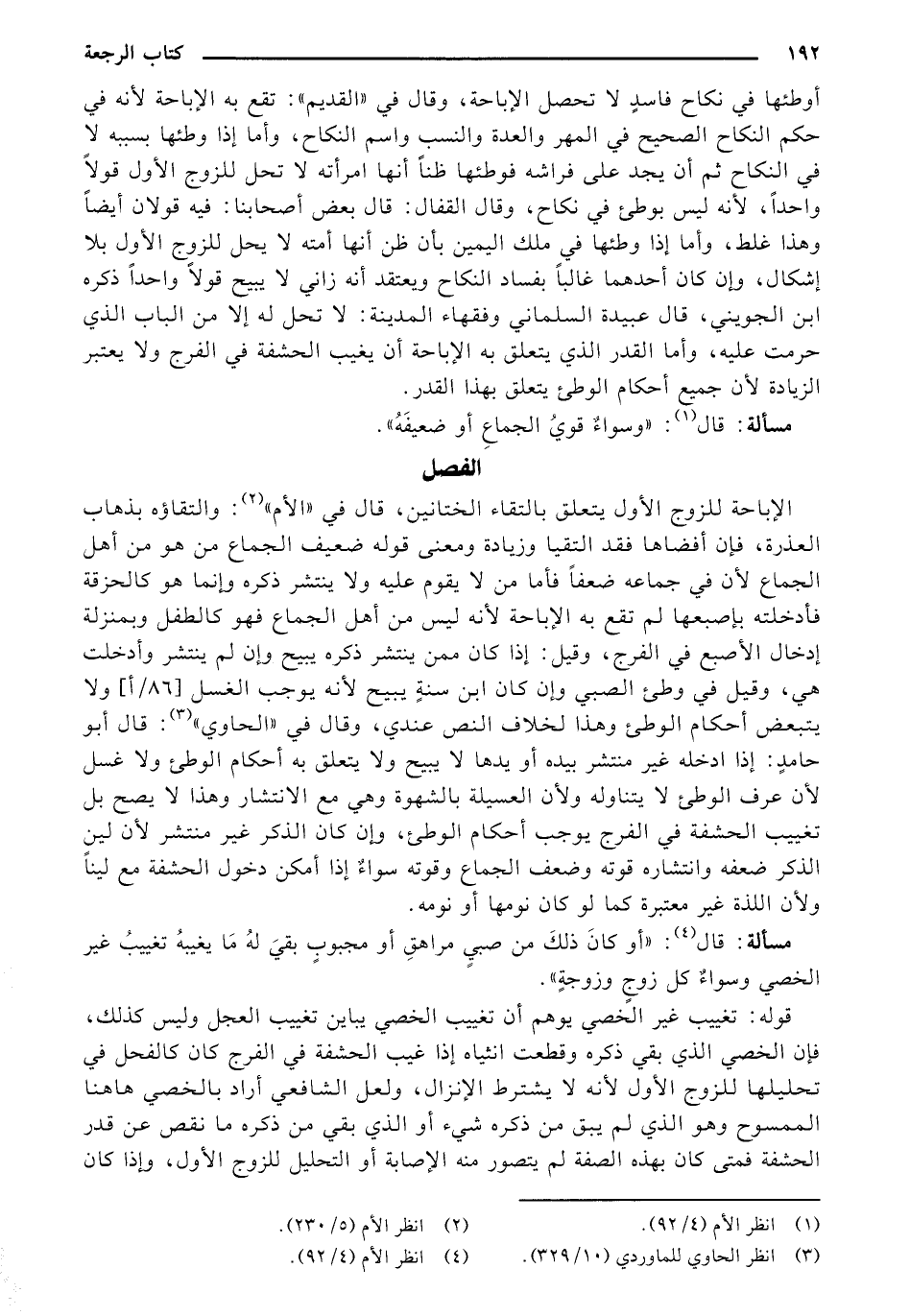 الإباحة للزوج الأول يتعلق بالتقاء الختانين، قال في "الأم": والتقاؤه بذهاب العذرة، فإن أفضاها فقد التقيا وزيادة ومعنى قوله ضعيف الجماع من هو أهل الجماع لأن في جماعه ضعفا فأما من لا يقوم علية ولا ينتشر ذكره وإنما هو كالحزقة فأدخلته بإصبعها لم تقع به الإباحة لأنه ليس من أهل الجماع فهو كالطفل وبمنزلة إدخال الأصبع في الفرج، وقيل: إذا كان ممن ينتشر ذكره يبيح وإن لم ينتشر وأدخلت هي، وقيل في وطئ الصبي وإن كان ابن سنة يبيح لأنه يوجب الغسل [86/ أ] ولا يتبعض أحكام الوطئ وهذا لخلاف النص عندي، وقال في (الحاوي): قال أبو حامد: إذا ادخله غير منتشر بيده أو يدها لا يبيح ولا يتعلق به أحكام الطئ ولا غسل لأن عرف الوطئ لا يتناوله ولأن العسيلة بالشهوة وهى مع الانتشار وهذا لا يصح بل تغييب الحشفة في الفرج يوجب أحكام الوطئ، وإن كان الذكر غير منتشر لأن لين الذكر ضعفه وانتشاره قوته وضعف الجماع وقوته سواء إذا أمكن دخول الحشفة مع لينا ولأن اللذة غير معتبرة كما لو كان نومها أو نومه.