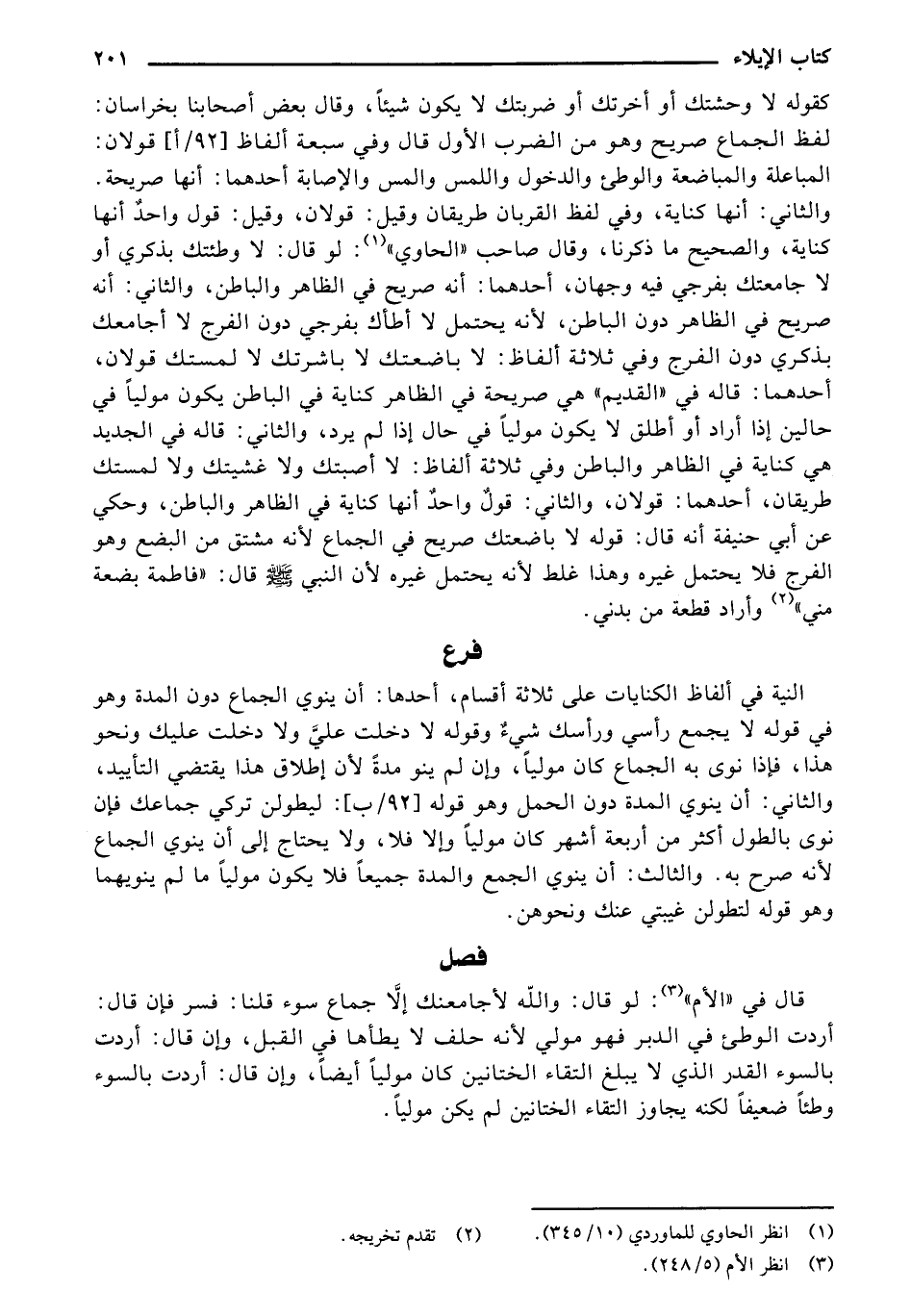 النية في ألفاظ الكتابات على ثلاثة أقسام، أحدها: أن ينوي الجماع دون المدة وهو في قوله لا يجمع رأسي ورأسك شيء وقوله لا دخلت عليَّ ولا دخلت عليك ونحو هذا، فإذا نوى به الجماع كان موليا، وإن لم ينو مدة لأن إطلاق هذا يقتضي التأييد، والثاني: إن ينوي المدة دون الحمل وهو قوله [92/ ب]: ليطولن تركي جماعك فإن نوي بالطول أكثر من أربعة أشهر كان موليا، غلا فلا، ولا يحتاج إلى أن ينوي الجماع لأنه صرح به. والثالث: أن ينوي الجمع والمدة جميعاً فلا يكون موليا ما لم ينويهما وهو قوله لتطولن غيبتي ونحوهن.