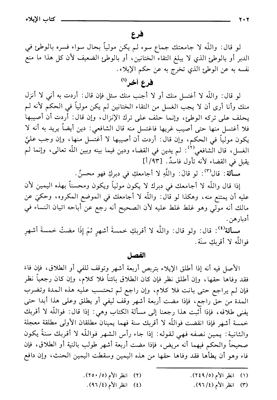 لو قال: والله لا أغتسل منك أو لا أجنب منك سئل فإن قال: أردت بة أني لا أنزل منك وأنا أرى أن لا يجب الغسل من التقاء الختانين لم يكن موليا في الحكم لأنه لم يحلف على تركه الوطئ، وإنما حلف على ترك الإنزال، وإن قال: أردت أن أصيبها فلا أغتسل منها حتى أصيب غريها فاغتسل منه قال الشافعي: دين أيضا يريد به أنة لا يكون موليا في الحكم، وإن قال: أردت أن أصيبها لا اغتسل منها، وإن وجب علي الغسل، قال الشافعي: لم يدين في القضاء ودين فيما بينه وبين الله تعالى، وإنما لم يقبل في القضاء لأنه تأول فاسد. [93/ أ]