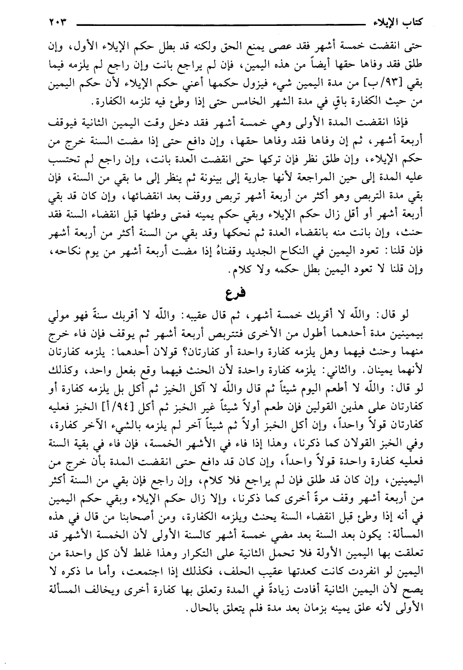 حتى انقضت خمسة أشهر فقد عصى يمنع الحق ولكنه قد بطل حكم الإيلاء الأول، وإن طلق فقد وفاها حقها أيضا من هذه اليمين، فإن لم يراجع بانت وإن راجع لم يلزمه فيما بقى [93/ ب] من مدة اليمين شيء فيزول حكمها أعنى حكم الإيلاء لأن حكم اليمين من حيث الكفارة باق في مدة الشهر الخامس حتى إذا وطئ فيه تلزمه الكفارة.