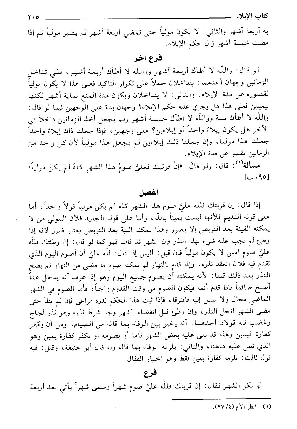 إذا قال: إن قربتك فلله علي صوم هذا الشهر كله لم يكن موليا قولا واحدا، أما على قوله القديم فلأنها ليست يمينا بالله، وأما على قوله الجديد فلأن المولي من لا يمكنه الفيئة بعد التربص إلا بضرر وهذا يمكنه النية بعد التربص يعتبر ضرر لأنه إذا وطئ لم يجب عليه شيء بهذا النذر فإن الشهر قد فات فهو كما لو قال: إن وطئتك فلله على صوم أمس لا يكون موليا فإن قيل: أليس إذا قال: لله علي أن أصوم اليوم الذي تقدم فيه فلان انعقد نذره، وإذا قدم بالنهار لم يمكنه صوم ما مضى من النهار ثم يصح النذر بعد ذلك قلنا: لأنه يمكنه أن يصوم جميع اليوم وهو إذا عرف انه يدخل غدا أصبح صائما فإذا قدم أتمه فيكون الصوم من وقت القدوم واجبا، فأما الصوم في الشهر الماضي محال ولا سبيل إليه فافترقا، فإذا ثبت هذا الحكم نذره مراعى فإن لم يطأ حتى مضى الشهر انحل النذر، وإن وطئ قبل انقضاء الشهر وجد شرط نذره وهو نذر لجاج وغضب فيه قولان أحدهما: أنه يخير بين الوفاء بما قاله من الصيام، ومن أن يكفر كفارة اليمين وهذا قد بقي عليه بعض الشهر فأما أو بصومه أو يكفر كفارة يمين وهو الذي نص عليه هاهنا، والثاني: يلزمه الوفاء بما قاله وبه قال أبو حنيفة، وقيل: فيه قول ثالث: يلزمه كفارة يمين فقط وهو اختيار القفال.