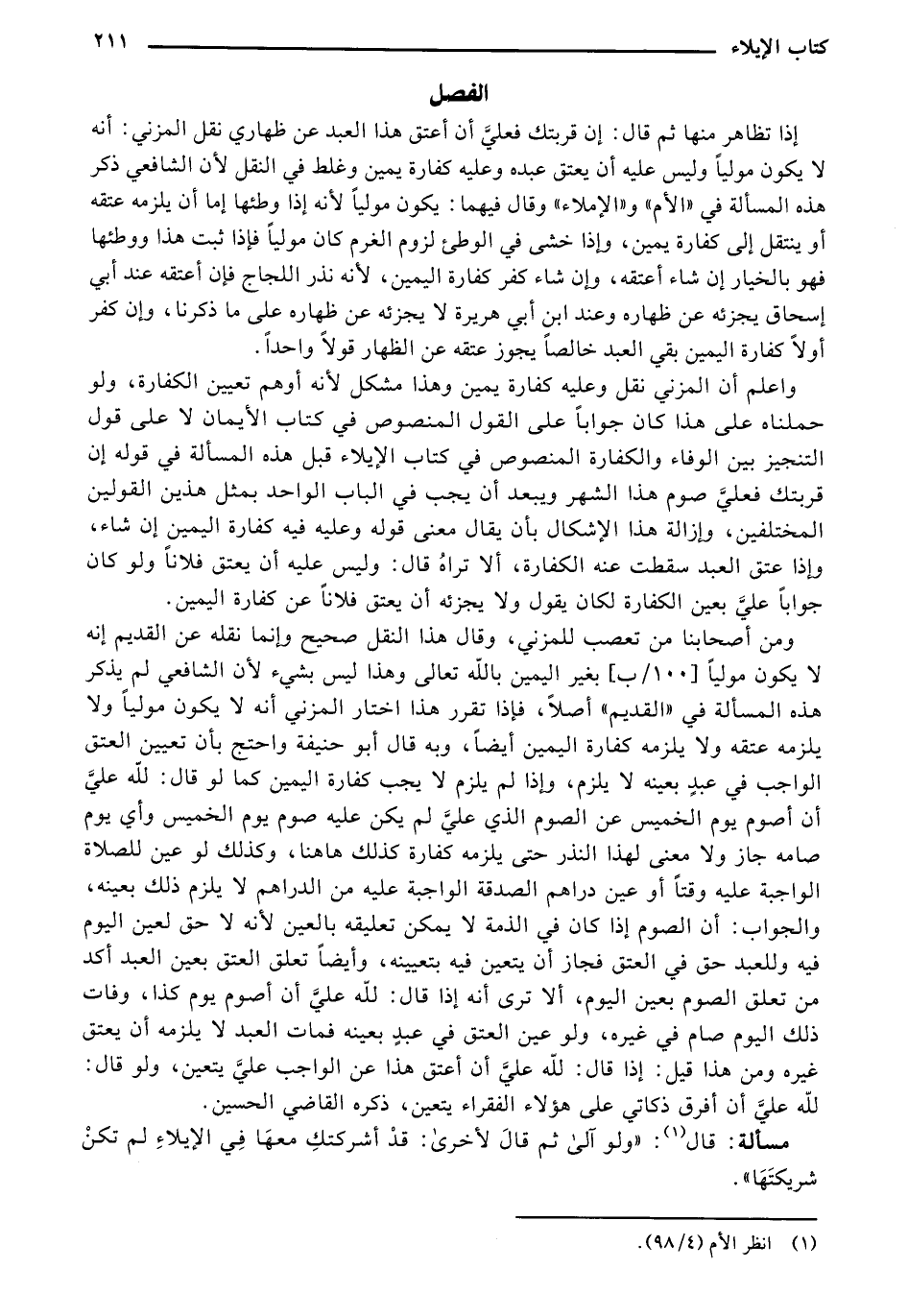 واعلم أن المزني نقل وعليه كفارة يمين وهذا مشكل لأنه أوهم تعيين الكفارة، ولو حملناه على هذا كان جوابًا على القول المنصوص في كتاب الأيمان لا على قول التنجيز بين الوفاء والكفارة المنصوص في كتاب الإيلاء قبل هذه المسألة في قوله إن قربتك فعليَّ صوم هذا الشهر ويبعد أن يجب في الباب الواحد بمثل هذين القولين المختلفين، وإزالة هذا الإشكال بأن يقال معنى قوله وعليه فيه كفارة اليمين إن شاء، وإذا اعتق العبد سقطت عنه الكفارة، ألا تراه قال: وليس عليه أن يعتق فلانًا ولو كان جوابًا عليَّ بعين الكفارة لكان يقول ولا يجزئه أن يعتق فلاناً عن كفارة اليمين.