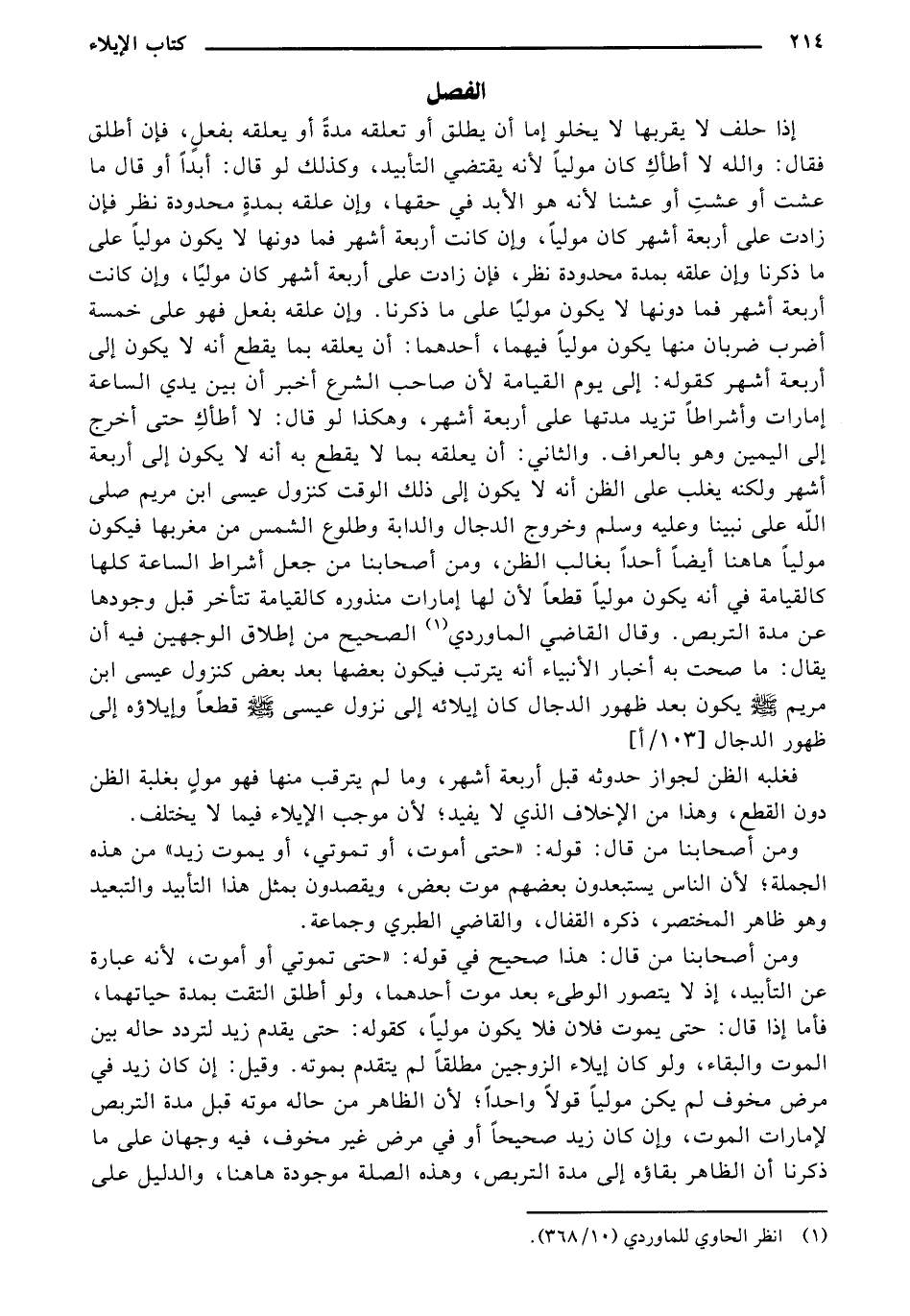 إذا حلف لا يقربها لا يخلو إما أن يطلق أو تعلقه مدة أو يعلقه بفعل، فإن أطلق فقال: والله لا أطأك كان موليًا لأنه يقتضي التأبيد، وكذلك لو قال: أبدًا أو قال ما عشت أو عشتِ أو عشنا لأنه هو الأبد في حقها، وإن علقه بمدة محدودة نظر فإن زادت على أربعة أشهر كان موليًا، وإن كانت أربعة أشهر فما دونها لا يكون موليًا على ما ذكرنا وإن علقه بمدة محدودة نظر، فإن زادت على أربعة أشهر كان موليًا، وإن كانت أربعة أشهر فما دونها لا يكون موليًا على ما ذكرنا، وإن علقه بفعل فهو على خمسة أضرب ضربان منها يكون موليًا فيهما، أحدهما: أن يعلقه بما يقطع أنه لا يكون إلى أربعة أشهر كقوله: إلى يوم القيامة لأن صاحب الشرع أخبر أن بين يدي الساعة إمارات وأشراطًا تزيد مدتها على أربعة أشهر، وهكذا لو قال: لا أطأكِ حتى أخرج إلى اليمين وهو بالعراف. والثاني: أن يعلقه بما لا يقطع به أنه لا يكون إلى أربعة أشهر ولكنه يغلب على الظن أنه لا يكون إلى ذلك الوقت كنزول عيسى ابن مريم صلى الله على نبينا وعليه وسلم وخروج الدجال والدابة وطلوع الشمس من مغربها فيكون موليًا هاهنا أيضًا أحدًا بغالب الظن، ومن أصحابنا من جعل أشراط الساعة كلها كالقيامة في أنه يكون موليًا قطعًا لأن لها إمارات منذورة كالقيامة تتأخر قبل وجودها عن مدة التربص. وقال القاضي الماوردي الصحيح من إطلاق الوجهين فيه أن يقال: ما صحت به أخبار الأنبياء أنه يترتب فيكون بعضها بعد بعض كنزول عيسى ابن مريم صلى الله عليه وسلم يكون بعد ظهور الدجال كان إيلائه إلى نزول عيسى صلى الله عليه وسلم قطعًا وإيلاؤه إلى ظهور الدجال [103/أ].