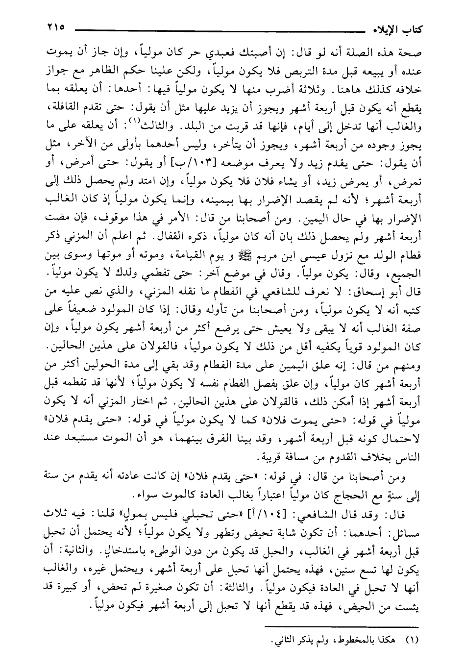 صحة هذه الصلة أنه لو قال: إن أصبتك فعبدي حر كان موليًا، وإن جاز أن يموت عنده أو يبيعه قبل مدة التربص فلا يكون موليًا، ولكن علينا حكم الظاهر مع جواز خلافه كذلك هاهنا. وثلاثة أضرب منها لا يكون موليًا فيها: أحدها: أن يعلقه بما يقطع أنه يكون قبل أربعة اشهر ويجوز أن يزيد عليها مثل أن يقول: حتى تقدم القافلة، والغالب أنها تدخل إلى أيام، فإنها قد قربت من البلد. والثالث: أن يعلقه على ما يجوز وجوده من أربعة أشهر، ويجوز أن يتأخر، وليس أحدهما بأولى من الآخر، مثل أن يقول: حتى يقدم زيد ولا يعرف موضعه [103/ب] أو يقول: حتى أمرض، أو تمرض، أو يمرض زيد، أو يشاء فلان فلا يكون موليًا، وإن امتد ولم يحصل ذلك إلى أربعة أشهر؛ لأنه لم يقصد الإضرار بها بيمينه، وإنما يكون موليًا إذ كان الغالب الإضرار بها في حال اليمين. ومن أصحابنا من قال: الأمر في هذا موقوف، فإن مضت أربعة أشهر ولم يحصل ذلك بأن أنه كان موليًا، ذكره القفال. ثم اعلم أن المزني ذكر فطام الولد مع نزول عيسى ابن مريم صلى الله عليه وسلم ويوم القيامة، وموته أو موتها وسوى بين الجميع، وقال: يكون موليًا. وقال في موضع آخر: حتى تفطمي ولدك لا يكون موليًا. قال أبو إسحاق: لا نعرف للشافعي في الفطام ما نقله المزني، والذي نص عليه من كتبه أنه لا يكون موليًا، ومن أصحابنا من تأوله وقال: إذا كان المولود ضعيفًا على صفة الغالب أنه لا يبقى ولا يعيش حتى يرضع أكثر من أربعة أشهر يكون موليًا، وإن كان المولود قويًا يكفيه أقل من ذلك لا يكون موليًا، فالقولان على هذين الحالين. ومنهم من قال: إنه علق اليمين على مدة الفطام وقد بقي إلى مدة الحولين أكثر من أربعة أشهر كان موليًا، وإن علق بفصل الفطام نفسه لا يكون موليًا؛ لأنها قد تفطمه قبل أربعة أشهر إذا أمكن ذلك، فالقولان على هذين الحالين. ثم اختار المزني أنه لا يكون موليًا في قوله: "حتى يموت فلان" كما لا يكون موليًا في قوله: "حتى يقدم فلان" لاحتمال كونه قبل أربعة أشهر، وقد بينا الفرق بينهما، هو أن الموت مستبعد عند الناس بخلاف القدوم من مسافة قريبة.