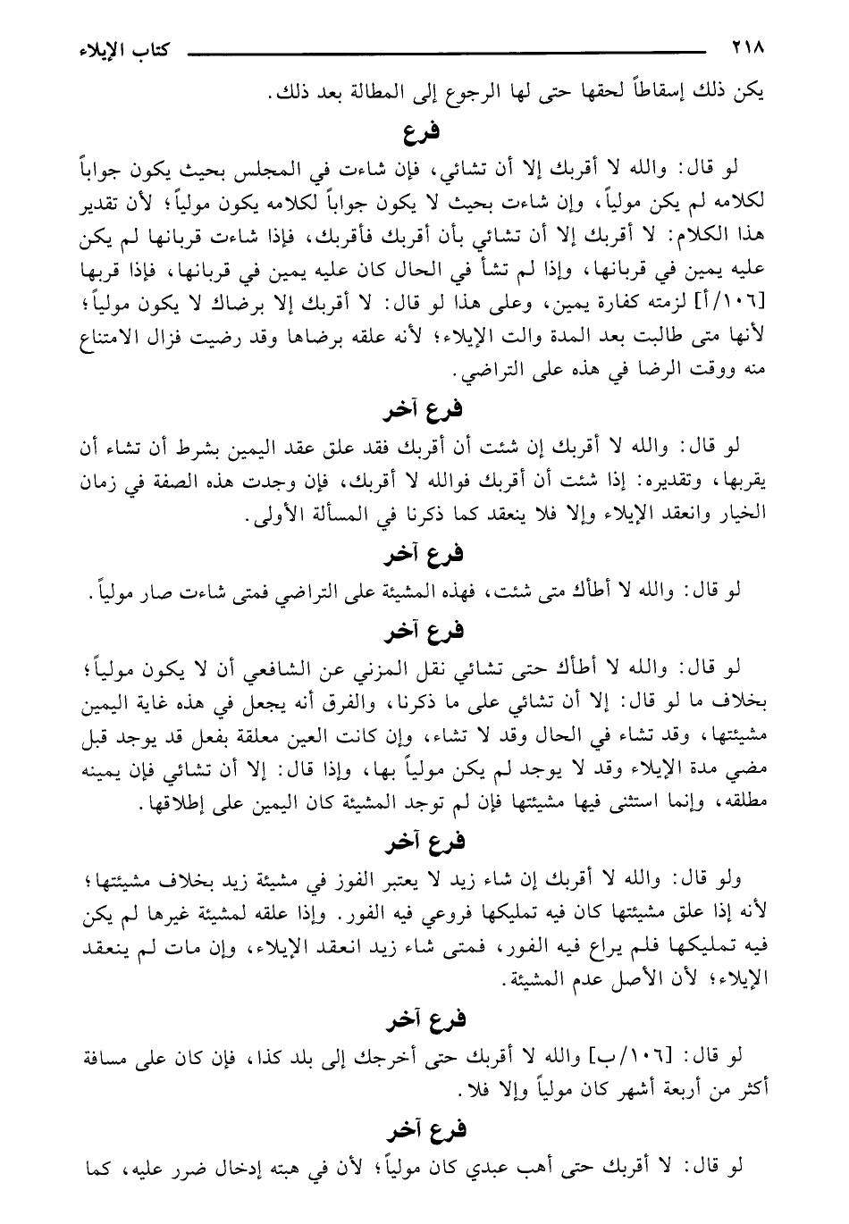 لو قال: والله لا أقربك إلا أن تشائي، فإن شاءت في المجلس بحيث يكون جوابًا لكلامه لم يكن موليًا، وإن شاءت بحيث لا يكون جوابًا لكلامه يكون موليًا، لأن تقدير هذا الكلام: لا أقربك إلا أن تشائي بأن أقربك فأقربك، فإذا شاءت قربانها لم يكن عليه يمين في قربانها، وإذا لم تشأ في الحال كان عليه يمين في قربانها، فإذا قربها [106/ أ] لزمته كفارة يمين، وعلى هذا لو قال: لا أقربك إلا برضاك لا يكون موليًا؛ لأنها متى طالبت بعد المدة والت الإيلاء؛ لأنه علقه برضاها وقد رضيت فزال الامتناع منه ووقت الرضا في هذه على التراضي.