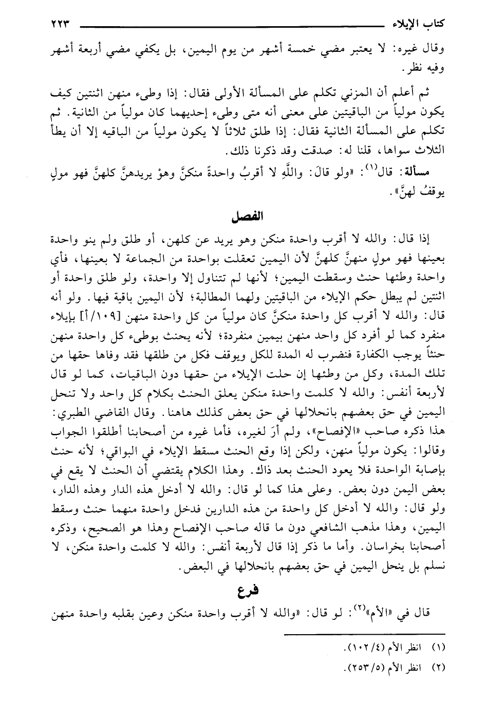 ثم أعلم أن المزني تكلم على المسألة الأولى فقال: إذا وطئ منهن اثنتين كيف يكون موليًا من الباقيتين على معنى أنه متى وطئ إحديهما كان موليًا من الثانية. ثم تكلم على المسألة الثانية فقال: إذا طلق ثلاثًا لا يكون موليًا من الباقيه إلا أن يطأ الثلاث سواها، قلنا له: صدقت وقد ذكرنا ذلك.