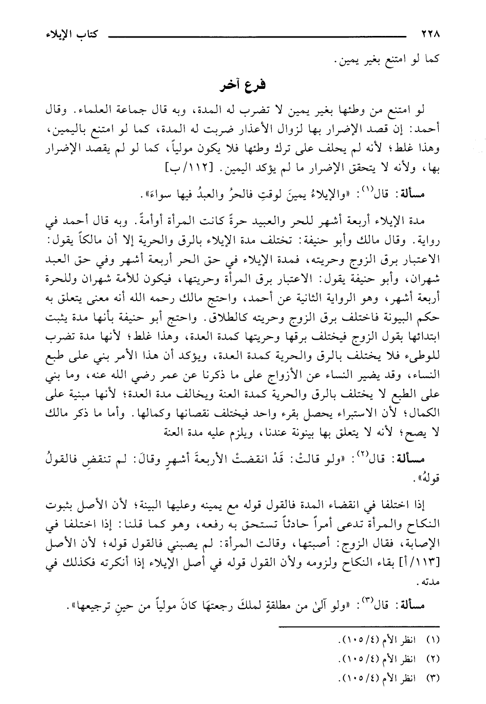 مدة الإيلاء أربعة أشهر للحر والعبيد حرة كانت المرأة أو أمة. وبه قال أحمد في رواية. وقال مالك وأبو حنيفة: تختلف مدة الإيلاء بالرق والحرية إلا أن مالكًا يقول: الاعتبار برق الزوج وحريته، فمدة الإيلاء في حق الحر أربعة أشهر وفي حق العبد شهران، وأبو حنيفة يقول: الاعتبار برق المرأة وحريتها، فيكون للأمة شهران وللحرة أربعة أشهر، وهو الرواية الثانية عن أحمد، واحتج مالك رحمه الله أنه معنى يتعلق به حكم البينونة فاختلف برق الزوج وحريته كالطلاق. واحتج أبو حنيفة بأنها مدة يثبت ابتدائها بقول الزوج فيختلف برقها وحريتها كمدة العدة، وهذا غلط؛ لأنها مدة تضرب للوطئ فلا يختلف بالرق والحرية كمدة العدة، ويؤكد أن هذا الأمر بني على طبع النساء، وقد يضير النساء عن الأزواج على ما ذكرنا عن عمر رضي الله عنه، وما بني على الطبع لا يختلف بالرق والحرية كمدة العنة ويخالف مدة العدة؛ لأنها مبنية على الكمال؛ لأن الاستبراء يحصل بقرء واحد فيختلف نقصانها وكمالها. وأما ما ذكر مالك لا يصح؛ لأنه لا يتعلق بها بينونة عندنا، ويلزم عليه مدة العنة.