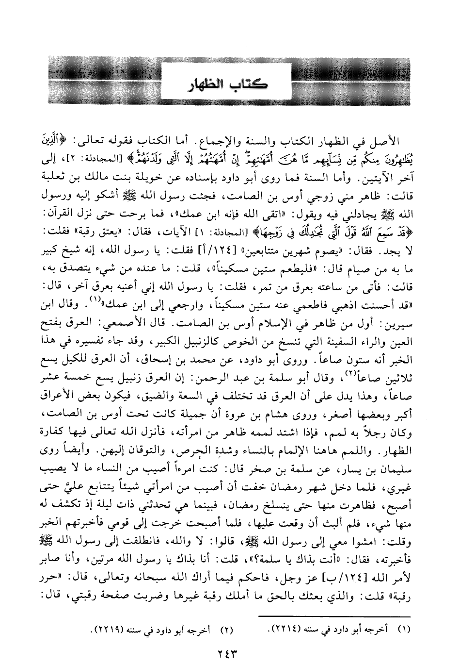 الأصل في الظهار الكتاب والسنة والإجماع. أما الكتاب فقوله تعالى: {الَّذِينَ يُظَاهِرُونَ مِنكُم مِّن نِّسَائِهِم مَّا هُنَّ أُمَّهَاتِهِمْ إنْ أُمَّهَاتُهُمْ إلاَّ اللاَّئِي ولَدْنَهُمْ} [المجادلة:2]، إلى آخر الآيتين. وأما السنة فما روى أبو داود بإسناده عن خويلة بنت مالك بن ثعلبة قالت: ظاهر مني زوجي أوس بن الصامت، فجئت رسول الله صلى الله عليه وسلم أشكو إليه ورسول الله صلى الله عليه وسلم يجادلني فيه ويقول: "اتقى الله فإنه ابن عمك"، فما برحت حتى نزل القرآن {قَدْ سَمِعَ اللَّهُ قَوْلَ الَّتِي تُجَادِلُكَ فِي زَوْجِهَا} [المجادلة:1] الآيات: فقال: "يعتق رقبة" فقلت لا يجد. فقال: "يصوم شهرين متتابعين" [124/ أ] فقلت: يا رسول الله، إنه شيخ كبير ما به من صيام قال: "فليطعم ستين مسكينًا"، قلت: ما عنده من شيء يتصدق به، قالت: فأتى من ساعته بعرق من تمر، فقلت: يا رسول الله إني أعنيه بعرق آخر، قال: "قد أحسنت اذهبي فاطعمي عنه ستين مسكينًا، وارجعي إلى ابن عمك". وقال ابن سيرين: أول من ظاهر في الإسلام أوس بن الصامت. قال الأصمعي: العرق بفتح العين والراء السفينة التي تنسخ من الخوص كالزنبيل الكبير، وقد جاء تفسيره في هذا الخبر أنه ستون صاعًا. وروي أبو داود، عن محمد بن إسحاق، أن العرق للكيل يسع ثلاثين صاعًا، وقال أبو سلمة بن عبد الرحمن: إن العرق زنبيل يسع خمسة عشر صاعًا، وهذا يدل على أن العرق قد تختلف في السعة والضيق، فيكون بعض الأعراق أكبر وبعضها أصغر، وروي هشام بن عروة أن جميلة كانت تحت أوس بن الصامت، وكان رجلًا به لمم، فإذا اشتد لممه ظاهر من امرأته، فأنزل الله تعالى فيها كفارة الظهار. واللمم هاهنا الإلمام بالنساء وشدة الخحرص، والتوقان إليهن. وأيضًا روي سليمان بن يسار، عن سلمة بن صخر قال: كنت امرءًا أصيب من النساء ما لا يصيب غيري، فلما دخل شهر رمضان خفت أن أصيب من امرأتي شيئًا يتتابع عليَّ حتى أصبح، فظاهرت منها حتى ينسلخ رمضان، فبينما هي تحدثني ذات ليلة إذ تكشف له منها شيء، فلم ألبث أن وقعت عليها، فلما أصبحت خرجت إلى قومي فأخبرتهم الخبر وقلت: امشوا معي إلى رسول الله صلى الله عليه وسلم، قالوا: لا والله، فانطلقت إلى رسول الله صلى الله عليه وسلم فأخبرته، فقال: "أنت بذاك يا سلمة؟ "، قلت: أنا بذاك يا رسول الله مرتين، وأنا صابر لأمر الله [124/ ب] عز وجل، فاحكم فيما أراك الله سبحانه وتعالى، قال: "حرر رقبة" قلت: والذي بعثك بالحق ما أملك رقبة غيرها وضربت صفحة رقبتي، قال: