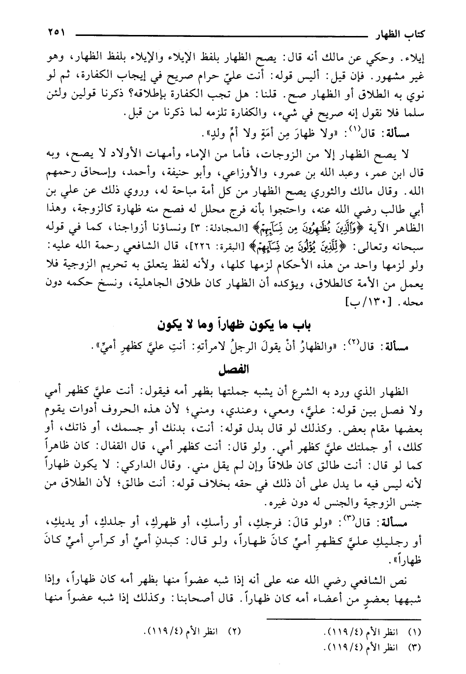 لا يصح الظهار إلا من الزوجات، فأما من الإماء وأمهات الأولاد لا يصح، وبه قال ابن عمر، وعبد الله بن عمرو، والأوزاعي، وأبو حنيفة، وأحمد، وإسحاق رحمهم الله. وقال مالك والثوري يصح الظهار من كل أمة مباحة له، وروي ذلك عن علي بن أبي طالب رضي الله عنه، واحتجوا بأنه فرج محلل له فصح منه ظهارة كالزوجة، وهذا الظاهر الآية "والَّذِينَ يُظَاهِرُونَ مِن نِّسَائِهِمْ" [المجادلة:3] ونساؤنا أزواجنا، كما في قوله سبحانه وتعالى: "لِلَّذِينَ يُؤْلُونَ مِن نِّسَائِهِمْ" [البقرة: 226]، قال الشافعي رحمة الله عليه: ولو لزمها واحد من هذه الأحكام لزمها كلها، ولأنه لفظ يتعلق به تحريم الزوجية فلا يعمل من الأمة كالطلاق، ويؤكده أن الظهار كان طلاق الجاهلية، ونسخ حكمه دون محله. [130/ ب].