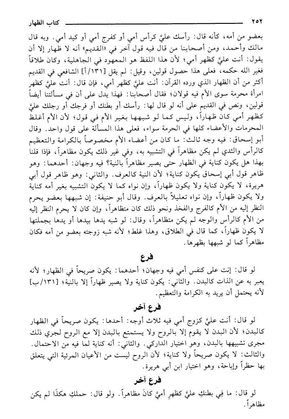 بعضو من أمه، كأنه قال: رأسك عليَّ كرأس أمي أو كفرج أمي أو كيد أمي. وبه قال مالك وأحمد، ومن أصحابنا من قال فيه قول آخر في "القديم" أنه لا ظهار إلا أن يقول: أنت عليَّ كظهر أمي؛ لأن هذا اللفظ هو المعهود في الجاهلية، وكان طلاقًا فغير الله حكمه، فعلى هذا حصول قولين، وقيل: لم يقل [131/ أ] الشافعي في القديم أكثر من أن الظهار الذي ورده القرآن: أنت عليَّ كظهر أمي، فإن قال: أنت عليَّ كظهر امرأة محرمة سوى الأم فيه قولان؛ فقال أصحابنا: فهذا يدل على أن في مسألتنا أيضًا قولين، ونص في القديم على أنه لو قال لها: رأسك أو بطنك أو فرجك أو رجلك عليَّ كظهر أمي كان ظهارًا، وليس كما لو شبهها بغير الأم في قول؛ لأن الأم أغلظ المحرمات والأعضاء كلها في الحرمة سواء، فعلى هذا المسألة على قول واحد. وقال أبو إسحاق: فيه وجه ثالث: ما كان من أعضاء الأم مخصوصًا بالكرامة والتعظيم كالرأس والثدي لم يكن مظاهرًا في التشبيه به، وفي غير ذلك يكون مظاهرًا، فإذا قلنا بهذا هل يكون كناية في الظهار حتى يصير مظاهرًا بالنية؟ فيه وجهان: أحدهما: وهو ظاهر قول أبي إسحاق يكون كناية؛ لأن النية كالعرف. والثاني: وهو ظاهر قول أبي هريرة، لا يكون كناية ولا يكون ظهارًا، وإن نواه كما لا يكون التشبيه بغير أمه كناية ولا يكون ظهارًا، وإن نواه تعليلًا بالعرف. وقال أبو حنيفة: إن شبهها بعضو يحرم النظر إليه من الأم كالفرج والفخذ ونحو ذلك كان متظاهرًا، وإن كان لا يحرم النظر إليه من الأم كالرأس والوجه لم يكن متظاهرًا، وقال: لو شبه يدها بيدها أو يدها بجملتها لا يكون ظهارًا، كما قال في الطلاق، وهذا غلط؛ لأنه شبه زوجته بعضو من أمه فكان مظاهرًا كما لو شبهها بظهرها.