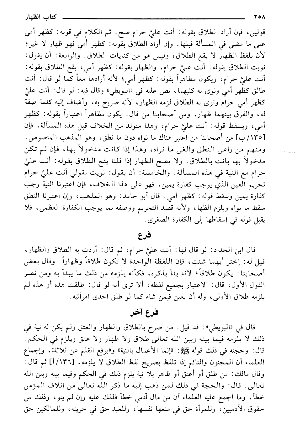 قولين، فإن أراد الطلاق بقوله: أنت عليَّ حرام صح. ثم الكلام في قوله: كظهر أمي على ما مضى في المسألة قبلها. وإن أراد الطلاق بقوله: كظهر أمي فهو ظهار لا غير؛ لأن بلفظ الظهار لا يقع الطلاق، وليس هو من كنايات الطلاق. والرابعة: أن يقول: نويت الطلاق بقوله: أنت عليَّ حرام، والظهار بقوله: كظهر أمي، يقع الطلاق بقوله: أنت عليَّ حرام، ويكون مظاهرًا بقوله: كظهر أمي؛ لأنه أرادها معًا كما لو قال: أنت طالق كظهر أمي ونوى به كليهما، نص عليه في "البويطي" وقال فيه: لو قال: أنت عليَّ كظهر أمي حرام ونوى به الطلاق لزمه الظهار، لأنه صريح به، وأضاف إليه كلمة صفة له، والفرق بينهما ظهار، ومن أصحابنا من قال: يكون مظاهرًا اعتبارًا بقوله: كظهر أمي، ويسقط قوله: أنت عليَّ حرام، وهذا متولد من الخلاف قبل هذه المسألة، فإن [135/ ب] من أصحابنا من اعتبر هناك ما نواه دون ما نطق، وهو المذهب المنصوص. ومنهم من راعى النطق وألغى ما نواه، وهذا إذا كانت مدخولًا بها، فإن لم تكن مدخولًا بها بانت بالطلاق. ولا يصح الظهار إذا قلنا يقع الطلاق بقوله: أنت عليَّ حرام مع النية في هذه المسألة. والخامسة: أن يقول: نويت بقولي أنت عليَّ حرام تحريم العين الذي يوجب كفارة يمين، فهو على هذا الخلاق، فإن اعتبرنا النية وجب كفارة يمين وسقط قوله: كظهر أمي. قال أبو حامد: وهو المذهب، وإن اعتبرنا النطق سقط ما نواه ويلزم الظهار، ولأنه قصد التحريم ووصفه بما يوجب الكفارة العظمى، فلا يقبل قوله في إسقاطها إلى الكفارة الصغرى.