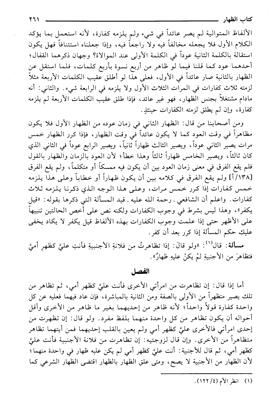 ومن أصحابنا من قال: الظهار الثاني في زمان عوده من الظهار الأول فلا يكون مظاهرًا في وقت العود كما لا يكون عائدًا في وقت الظهار، فإذا كرر الظهار خمس مرات يصير الثاني عودًا، ويصير الثالث ظهارًا ثانيًا، ويصير الرابع عودًا في الثاني الذي كان ثالثًا، ويصير الخامس ظهارًا ثالثًا وهذا خطأ؛ لأن العود بالزمان والظهار بالقول فلم يقع الفرق في معنى زمان العود بين أن يكون فيه ممسكًا أو متكلمًا، ولم يقع الفرق [138/ أ] ولم يقع الفرق في كلامه بين أن يكون ظهارًا أو خطابًا وعلى هذا يلزمه خمس كفارات إذا كرر خمس مرات، وعلى هذا الوجه الذي ذكرنا يلزمه ثلاث كفارات. واعلم أن الشافعي. رحمة الله عليه. قيد المسألة التي ذكرها بقوله: "قيل يكفر"، وهذا ليس بشرط في وجوب الكفارات ولكنه نص على أخص الحالتين تنبيهًا على الأظهر حتى إذا علمت وجوب الكفارات بهذه الألفاظ قيل يكفر لا يكاد يخفي عليك حكم المسألة إذا كرر بعد أن كفر.