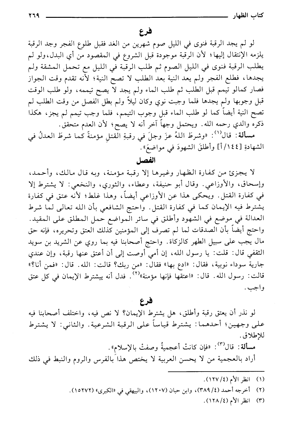 لا يجزئ من كفارة الظهار وغيرها إلا رقبة مؤمنة، وبه قال مالك، وأحمد، وإسحاق، والأوزاعي. وقال أبو حنيفة، وعطاء، والثوري، والنخعي: لا يشترط إلا في كفارة القتل. ويحكي هذا عن الأوزاعي أيضًا، وهذا غلط؛ لأنه عتق في كفارة يشترط فيه الإيمان كما في كفارة القتل. واحتج الشافعي بأن الله تعالى لما شرط العدالة في موضع في الشهود وأطلق في سائر المواضع حمل المطلق على المقيد. واحتج أيضًا بأن الصدقات لما لم تصرف إلى المؤمنين كذلك العتق وتحريره، فإنه حق مال يجب على سبيل الطهر كالزكاة. واحتج أصحابنا فيه بما روي عن الشريد بن سويد الثقفي قال: قلت: يا رسول الله، إن أمي أوصت إلى أن أعتق عنها رقبة، وإن عندي جارية سوداء نوبية، فقال: "ادع بها" فقال: "من ربك؟ قالت: الله. قال: "فمن أنا؟ " قالت: رسول الله. قال: "اعتقها فإنها مؤمنة". فدل أنه يشترط الإيمان في كل عتق واجب.