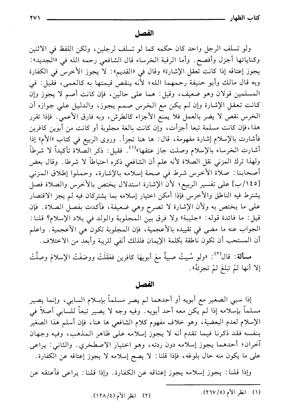 ولو تسلف الرجل واحد كان حكمه كما لو تسلف لرجلين، ولكن اللفظ في الاثنين وكناياتها أجزل وأفصح. وأما الرقبة الخرساء قال الشافعي رحمه الله في "الجديد": يجوز إعاقته إذا كانت تعقل الإشارة" وقال في "القديم": لا يجوز الأخرس في الكفارة وبه قال مالك وأبو حنيفة رحمهما الله؛ لأنه ينقص قيمتها به كالعمى، فقيل: في المسلمين قولان وهو ضعيف، وقيل: هما على حالين، فإن كانت أصم لا يجوز وإن كانت تعقل الإشارة وإن لم يكن مع الخرس صمم يجوز، والدليل على جوازه أن الخرس نقص لا يضر بالعمل فلا يمنع الأجزاء كالطرش، وبه فارق الأعمى. فإذا تقرر هذا، فإن كانت مسلمة تبعا أجرأت، وإن كانت بالغة مجلوبة أو كانت من أبوين كافرين فأشارت بالإسلام إشارة مفهومة، قال: ها هنا تجزأ. وروى الربيع في كتاب "الأم" إذا أشارت الخرساء بالإسلام وصلت جاز عتقها". فقيل: ذكر الصلاة تأكيدًا لا شرطًا ولهذا ترك المزني نقل الصلاة لأنه علم أن الشافعي ذكره احتياطًا لا شرطا. وقال بعض أصحابنا: صلاة الأخرس شرط في صحة إسلامه بالإشارة، وحملوا إطلاق المزني [145/ ب] على تفسير الربيع؛ لأن الإشارة استدلال يختص بالأخرس والصلاة فصل يشترط فيه الناطق والأخرس فإذا أمكن اختيار إسلامه بما يشتركان فيه لم يجز الاقتصار على ما يختص به ولأن الإشارة لا تصرح وهي ضعيفة، فأكدت بفصل الصلاة. فإن قيل: ما فائدة قوله: "جليبة" ولا فرق بين المجلوبة والولد في بلاد الإسلام؟ قلنا: الجواب عنه ما مضى في تقييده بالأعجمية، فإن المجلوبة تكون هي العجمية. واعلم أن المستحب أن تكون ناطقة بكلمة الإيمان فلذلك أنفي للريبة وأبعد من الاختلاف.