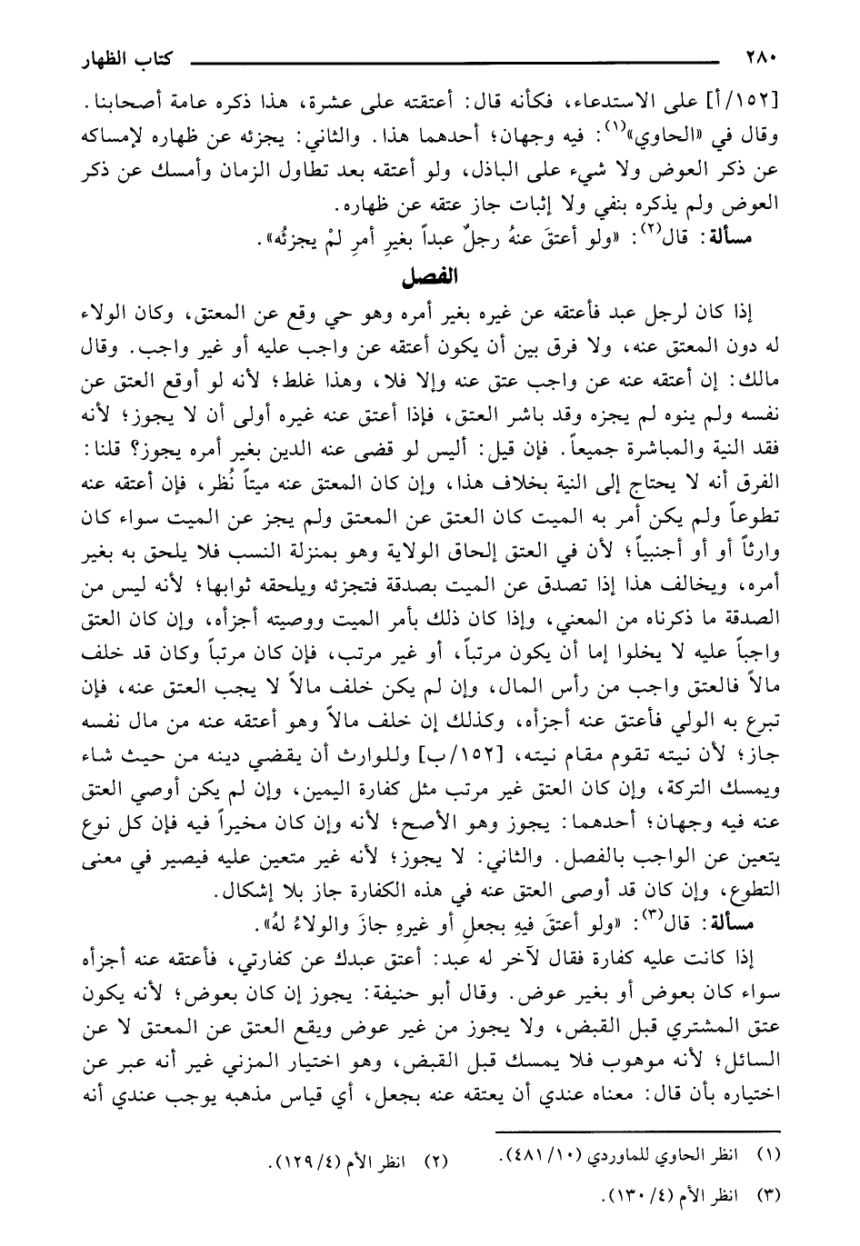إذا كان لرجل عبد فأعتقه عن غيره بغير أمره وهو حي وقع عن المعتق، وكان الولاء له دون المعتق عنه، ولا فرق بين أن يكون أعتقه عن واجب عليه أو غير واجب. وقال مالك: إن أعتقه عنه عن واجب عتق عنه وإلا فلا، وهذا غلط؛ لأنه لو أوقع العتق عن نفسه ولم ينوه لم يجزه وقد باشر العتق، فإذا اعتق عنه أولى أن لا يجوز؛ لأنه فقد النية والمباشرة جميعًا. فإن قيل: أليس لو قضى عنه الدين بغير أمره يجوز؟ قلنا: الفرق انه لا يحتاج إلى النية بخلاف هذا، وإن كان المعتق عنه ميتًا نُظر، فإن اعتقه عنه تطوعًا ولم يكن أمر به الميت كان العتق عن المعتق ولم يجز عن الميت سواء كان وارثًا أو أجنبيًا؛ لأن في العتق إلحاق الولاية وهو بمنزلة النسب فلا يلحق به بغير أمره، ويخالف هذا إذا تصدق عن الميت بصدقة فتجزئه ويلحقه ثوابها؛ لأن ليس من الصدقة ما ذكرناه من المعنى، وإذا كان ذلك بأمر الميت ووصيته اجزأه، وإن كان العتق واجبًا عليه لا يخلوا إما أن يكون مرتبًا، أو غير مرتب، فإن كان مرتبًا وكان قد خلف مالاً فالعتق واجب من رأس المال، وإن لم يكن خلف مالاً لا يجب العتق عنه، فغن تبرع به الولي فأعتق عنه اجزأه، وكذلك إن خلف مالاً وهو أعتقه عنه من مال نفسه جاز؛ لأن نيته تقوم مقام نيته، [152/ ب] وللوارث أن يقضي دينه من حيث شاء ويمسك التركة، وإن كان العتق غير مرتب كفارة اليمين، وإن لم يكن أوصي العتق عنه فيه وجهان؛ أحدهما: يجوز وهو الأصح؛ لأنه وإن كان مخيرًا فيه فإن كل نوع يتعين عن الواجب بالفصل. والثاني: لا يجوز؛ لأنه غير متعين عليه فيصير في معنى التطوع، وإن كان قد أوصى العتق عنه في هذه الكفارة جاز بلا إشكال.