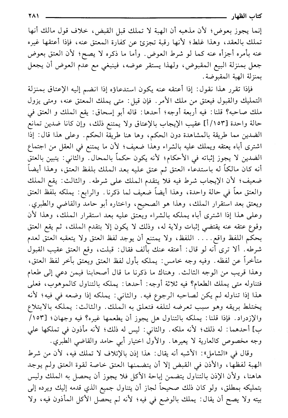 فإذا تقرر هذا نقول: إذا أعتقه عنه يكون استدعاؤه إذا انضم إليه الإعتاق بمنزلة التمليك والقبول فيعتق من ملك الأمر. فإن قيل: متى يملك المعتق عنه، ومتى يزول ملك صاحبه؟ قلنا: فيه أربعة أوجه؛ أحدها: قاله أبو إسحاق: يقع الملك والعتق في حالة واحدة [153/ أ] عقيب الإيجاب بالإعتاق ولا يمتنع ذلك، وإن كانا ضدين تمانع الضدين مما طريقة بالمشاهدة دون الحكم، وها هنا طريقة الحكم. وعلى هذا قال: إذا اشترى أباه يعتقه ويملك عليه بالشراء وهذا ضعيف؛ لأن ما يمتنع في العقل من اجتماع الضدين لا يجوز إثباته في الأحكام؛ لأنه يكون حكمًا بالمحال. والثاني: يتبين بالعتق أنه كان مالكًا له باستدعاء العتق ثم عتق عليه بعد الملك بلفظ العتق، وهذا أيضًا ضعيف؛ لأن الإيجاب شرط فيه فلا يتقدم الملك على شرطه. والثالث: يقع الملك والعتق معًا في حالة واحدة، وهذا أيضًا ضعيف لما ذكرنا. والرابع: يملكه بلفظ العتق ويعتق بعد استقرار الملك، وهذا هو الصحيح، واختاره أبو حامد والقاضي والطبري. وعلى هذا إذا اشترى أباه يملكه بالشراء ويعتق عليه بعد استقرار الملك، وهذا لأن وقوع عتقه عنه يقتضي إثبات ولاية له، وذلك لا يكون إلا بتقدم الملك، ثم يقع العتق بحكم اللفظ واقع .... اللفظ، ولا يمتنع أن يوجد لفظ العتق ولا يتعقبه العتق لعدم شرطه. ألا ترى أنه لو قال: أعتقه عنك بألف فقال: قبلت، وقع العتق عيب القبول متأخرًا عن لفظه. وفيه وجه خامس: يملكه بأول لفظ العتق ويعتق بآخر لفظ العتق، وهذا قريب من الوجه الثالث. وهناك ما ذكرنا ما قال أصحابنا فيمن دعي إلى طعام فتناوله متى يملك الطعام؟ فيه ثلاثة أوجه: أحدها: يملكه بالتناول كالموهوب، فعلى هذا إذا تناوله لم يكن لصاحبه الرجوع فيه. والثاني: يملكه إذا وضعه في فيه؛ لأنه يختلط بريقه وهو سبب تعرضه لتلفه فتعلق به الملك. والثالث: يملكه بالابتلاع والإزدراد. فإذا قلنا: يملكه بالتناول هل يجوز أن يطعمها غيره؟ فيه وجهان؛ [153/ ب] أحدهما: له ذلك؛ لأنه ملكه. والثاني: ليس له ذلك؛ لأنه مأذون في تملكها على وجه مخصوص كالعارية لا يعيرها. والأول اختيار أبي حامد والقاضي الطبري.