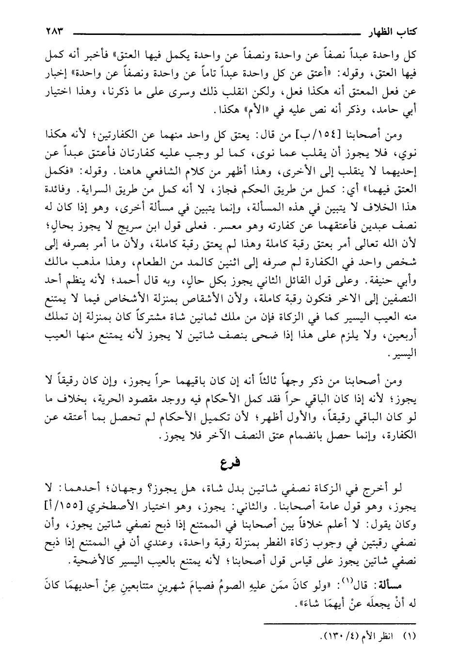 ومن أصحابنا [154/ ب] من قال: يعتق كل واحد منهما عن الكفارتين؛ لأنه هكذا نوي، فلا يجوز أن يقلب عما نوى، كما لو جب عليه كفارتان فأعتق عبدًا عن إحديهما لا ينقلب إلى الأخرى، وهذا أظهر من كلام الشافعي ها هنا. وقوله: "فكمل العتق فيهما" أي: كمل من طريق الحكم فجاز، لا أنه كمل من طريق السراية. وفائدة هذا الخلاف لا يتبين في هذه المسألة، وإنما يتبين في مسألة أخرى، وهو إذا كان له نصف عبدين فأعتقهما عن كفارته وهو معسر. فعلى قول ابن سريج لا يجوز بحالٍ؛ لأن الله تعالى أمر بعتق رقبة كاملة وهذا لم يعتق رقبة كاملة، ولأن ما أمر بصرفه إلى شخص واحد في الكفارة لم صرفه إلى اثنين كالمد من الطعام، وهذا مذهب مالك وأبي حنيفة. وعلى قول القائل الثاني يجوز بكل حالٍ، وبه قال أحمد؛ لأنه ينظم أحد النصفين إلى الآخر فتكون رقبة كاملة، ولأن الأشقاص بمنزلة الأشخاص فيما لا يمتنع منه العيب اليسير كما في الزكاة فإن من ملك ثمانين شاه مشتركًا كان بمنزلة إن تملك أربعين، ولا يلزم على هذا إذا ضحى بنصف شاتين لا يجوز لأنه يمتنع منها العيب اليسير.