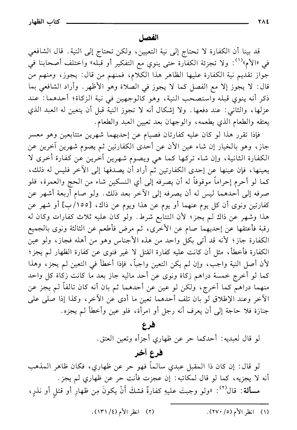فإذا تقرر هذا لو كان عليه كفارتان فصيام عن إحديهما شهرين متتابعين هو معسر جاز، وهو بالخيار إن شاء عين الأن عن أحدى الكفارتين ثم يصوم شهرين آخرين عن الكفارة الثانية، وإن شاء تركها كما هي ويصوم شهرين آخرين عن كفارة أخرى لا يعينها، فإن عينها عن إحدى الكفارتين ثم أراد أن يصدقها إلى الآخر فليس له ذلك، كما لو أحرم إحرامًا موقوفًا له أن يصرفه إلى أي النسكين شاء من الحج والعمرة، فلو صرفه إلى أحدهما ليس له أن يصرفه إلى الآخر بعد ذلك. ولو صام أربعة أشهر عن كفارتين ونوى أن كل يوم عنهما أو يوم عن هذا ويوم عن ذاك، [155/ ب] أو شهر عن هذا وشهر عن ذاك لم يجز؛ لأن التتابع شرط. ولو كان عليه ثلاث كفارات وكان له رقبة فأعتقها عن إحديهما صام عن الأخرى، ثم مرض فأطعم عن الثالثة ونوى بالجميع الكفارة جاز؛ لأنه قد أتى بكل واحد من هذه الأجناس وهو من أهله فجاز، ولو عين الكفارة فأخطأ، مثل أن كانت عليه كفارة القتل لا غير فنوى عن كفارة الظهار لم يجز؛ لأن أصل النية واجب، وإن لم يكن التعين واجبًا، فإذا أخطأ في التعين لم يجز، وهذا كما لو أخرج خمسة دراهم زكاة ونوى عن أحد ماليه جاز بعد ما كان تالفًا لم يجز عن الآخر وعند الإطلاق لو بان تلف أحدهما تعين ما أدى عن الآخر، وكذا إذا صلى على جنازة فلا حاجة إلى أن يعرف أنه رجل أو امرأة، فلو عين وأخطأ لم يجزه.