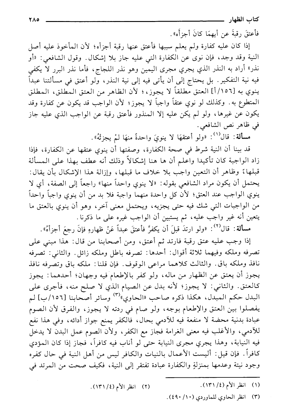 إذا كان عليه كفارة ولم يعلم سببها فأعتق عنها رقبة أجزأه؛ لأن المأخوذ عليه أصل النية وقد وجد، فإن نوى عن الكفارة التي عليه جاز بلا إشكال. وقول الشافعي: "أو نذر" أراد به النذر الذي يجري مجرى اليمين وهو نذر اللجاج، فأما نذر البرر لا يكفي فيه نية التفكير. بل يحتاج إلى أن يأتي فيه إلى نية النذر، ولو أعتق في مسألتنا عبدًا ينوي به [156/ أ] العتق مطلقًا لا يجوز؛ لأن الظاهر من العتق المطلق، المطلق المتطوع به. وكذلك لو نوي عتقًا واجبًا لا يجوز؛ لأن الواجب قد يكون عن كفارة وقد يكون غيرها، ولو لم يكن عليه إلا المنذور فأعتق رقبة عن الحواجب الذي عليه جاز في ظاهر نص الشافعي.