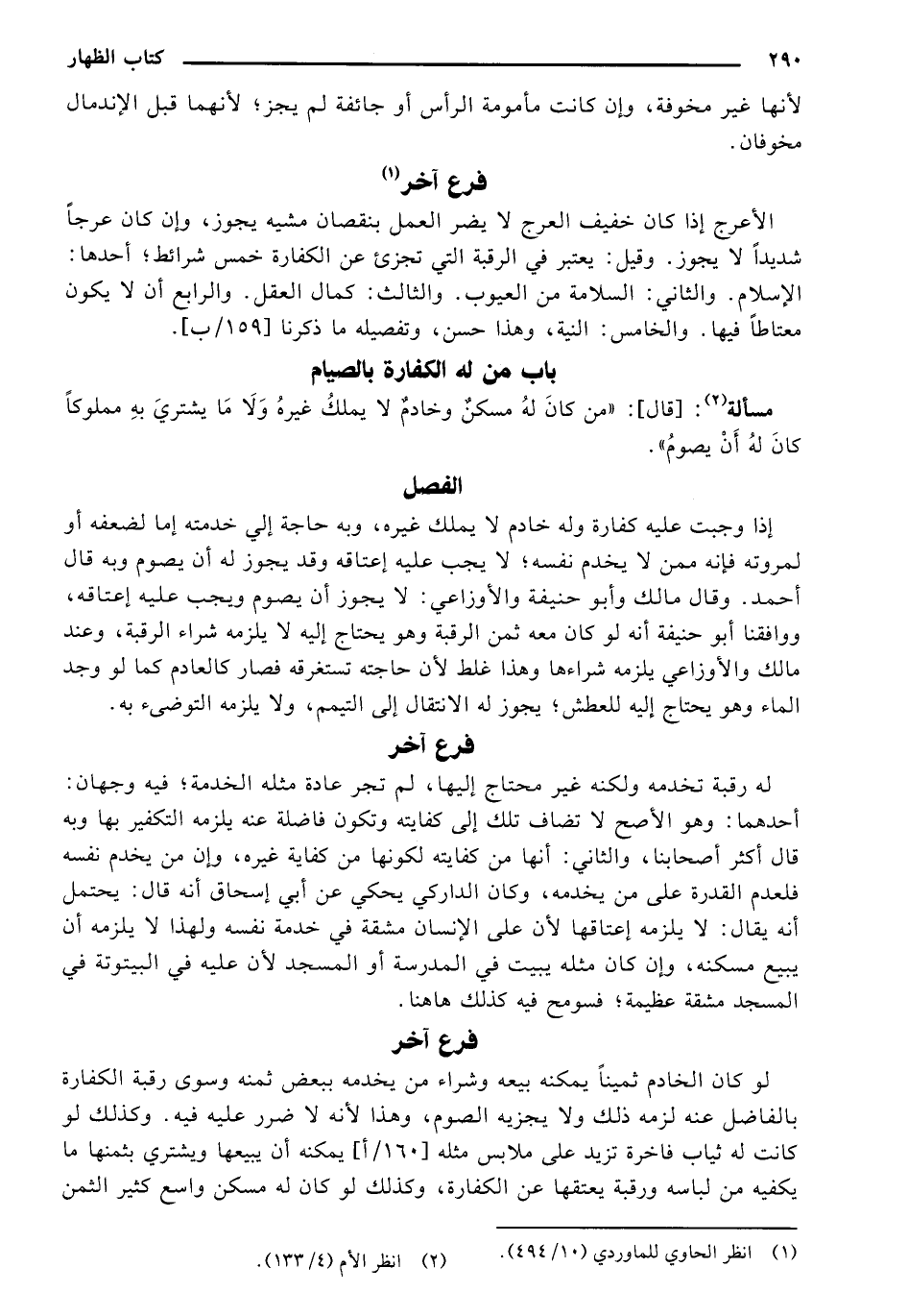 إذا وجبت عليه كفارة وله خادم لا يملك غيره، وبه حاجة إلى خدمته إما لضعفه أو لمروته فإنه ممكن لا يخدم نفسه؛ لا يجب عليه إعتاقه وقد يجوز له أن يصوم وبه قال أحمد. وقال مالك وأبو حنيفة والأوزاعي: لا يجوز أن يصوم ويجب عليه إعتاقه، ووافقنا أبو حنيفة أنه لو كان معه ثمن الرقبة وهو يحتاج إليه لا يلزمه شراء الرقبة، وعند مالك والأوزاعي يلزمه شراءها وهذا غلط لأن حاجته تستغرقه فصار كالعادم كما لو وجد الماء وهو يحتاج إليه للعطش؛ يجوز له الانتقال إلى التيمم، ولا يلزمه التوضؤ به.