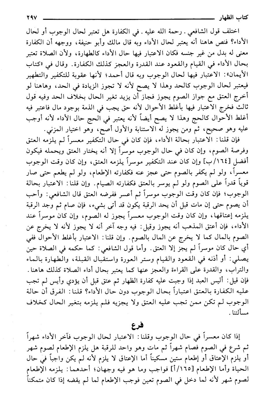 إذا كان معسرًا في حال الوجوب وقلنا: الاعتبار لحال الوجوب فآخر الأداء شهرًا ثم شرع في الصوم فصام شهرًا ثم مات وهو واحد للرقبة هل يلزم الإطعام لصوم شهر أو يلزم الإعتاق أو إطعام ستين مسكينًا أما الإعتاق لا يلزم لأنه لم يكن واجبًا في حال الحياة وأما الإطعام [165/ أ] فواجب وما هو فيه وجهان؛ أحدهما: يلزمه الإطعام لصوم شهر لأنه لما دخل في الصوم تعين فوجب الإطعام لما لم يقضه إذا كان متمكنًا