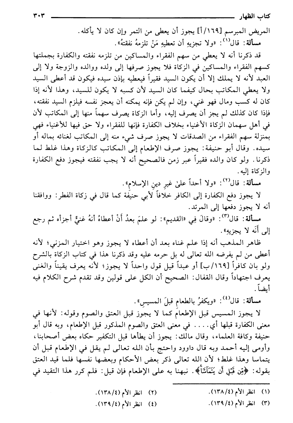 قد ذكرنا أنه لا يعطي من سهم الفقراء والمساكين من تلزمه نفقته والكفارة بجملتها كسهم الفقراء والمساكين في الزكاة فلا يجوز صرفها إلى ولده ووالده والزوجة ولا إلى العبد لأنه لا يملك إلا أن يكون السيد فقيرًا فيعطيه بإذن سيده فيكون قد أعطى السيد ولا يعطي المكاتب بحال كيفما كان السيد لأن كسبه لا يكون للسيد، وهذا لأنه إذا كان له كسب ومال فهو غني، وإن لم يكن فإنه يمكنه أن يعجر نفسه فيلزم السيد نفقته، فإذا كان كذلك لم يجز أن يصرف إليه، وأما الزكاة يصرف سهمًا منها إلى المكاتب لأن في أهل سهمان الزكاة الأغنياء بخلاف الكفارة فإنها للفقراء ولا حق فيها للأغنياء فهي بمنزلة سهم الفقراء من الصدقات لا يجوز صرف شيء منه إلى المكاتب لغنائه بماله أو سيده. وقال أبو حنيفة: يجوز صرف الإطعام إلى المكاتب كالزكاة وهذا غلط لما ذكرنا. ولو كان والده فقيرًا عبر زمن فالصحيح أنه لا يجب نفقته فيجوز دفع الكفارة والزكاة إليه.