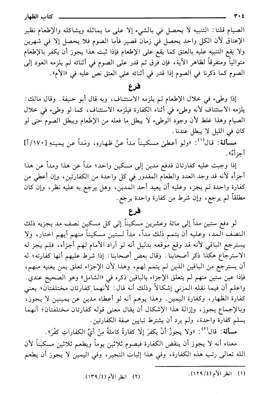 لو دفع ستين مدًا إلى مائة وعشرين مسكينًا إلى كل مسكين نصف مد يجزيه ذلك النصف المد، وعليه أن يتمم ذلك مدًا، مدًا لستين مسكينًا منهم أيهم اختار، ولا يسترجع الباقي لأنه قد وقع موقعه بدليل أنه لو أراد الأمام لهم أجزأه، فلم يجز له الاسترجاع هكذا ذكر أصحابنا. وقال بعض أصحابنا: إذا شرط عليهم أنها كفارته؛ له أن يسترجع من الباقين الذين لم يتمم لهم، وهذا لأن الإجزاء تعلق بمن يغنيه منهم، فإذا عين ستين منهم لم يتعلق الإجزاء بالباقين ذكره في "الشامل" وهو الصحيح عندي. واعلم أن فيما نقله المزني إشكالًا وذلك أنه قال: لأنهما كفارتان مختلفتان؛ يعني كفارة الظهار، وكفارة اليمين. وهذا يوهم أنه لو أعطاه مدين عن يمينين لا يجوز، وبالإجماع يجوز، وإزالة هذا الإشكال أن يقال معنى قوله كفارتان مختلفتان؛ أنهما يسلم كفارة واحدة، ولم يرد أن يشترط تبايين صفة الكفارتين.